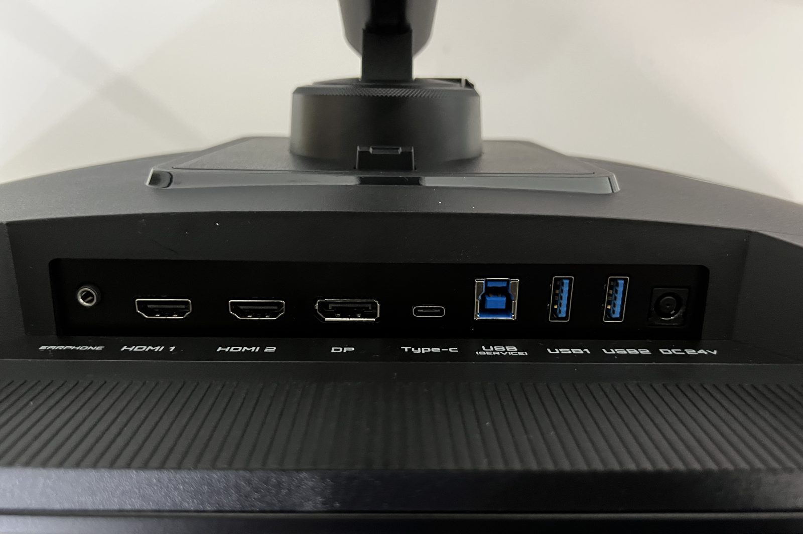 Conectivitatea este simplă: 2x HDMI 2.1, 1x DP, 1x USB C cu Power Delivery 18W, 2x USB A, 1x jack 3.5mm și 1x USB B service. E tot ce ai nevoie.