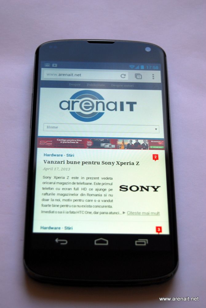 Ecranul de la Google Nexus 4 este la limita aceea de la care, daca mergi in sus, ochiul uman oricum nu mai vede diferenta. Pentru ca la 318 PPI, pe un display de 4.7 inch, e aproape imposibil sa mai vezi diferente fata de alte telefoane.