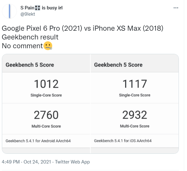 Noile Pixel 6 și Pixel 6 Pro sunt primele smartphone-uri de la Google cu SoC-ul proprietar Tensor. Tensor este cu până la 80% mai rapid decât Snapdragon 765G 5G de pe Pixel 5, însă Google s-a ferit să ofere cifre exacte legate de performanță. Acum începem să înțelegem și de ce. Pixel 6 obține în Geekbench 5 doar 1012 și 2760 puncte în operațiuni single-thread, respectiv multi-thread, mai puțin chiar și decât iPhone XS Max, telefon cu SoC Apple A12 lansat acum mai bine de 3 ani.
