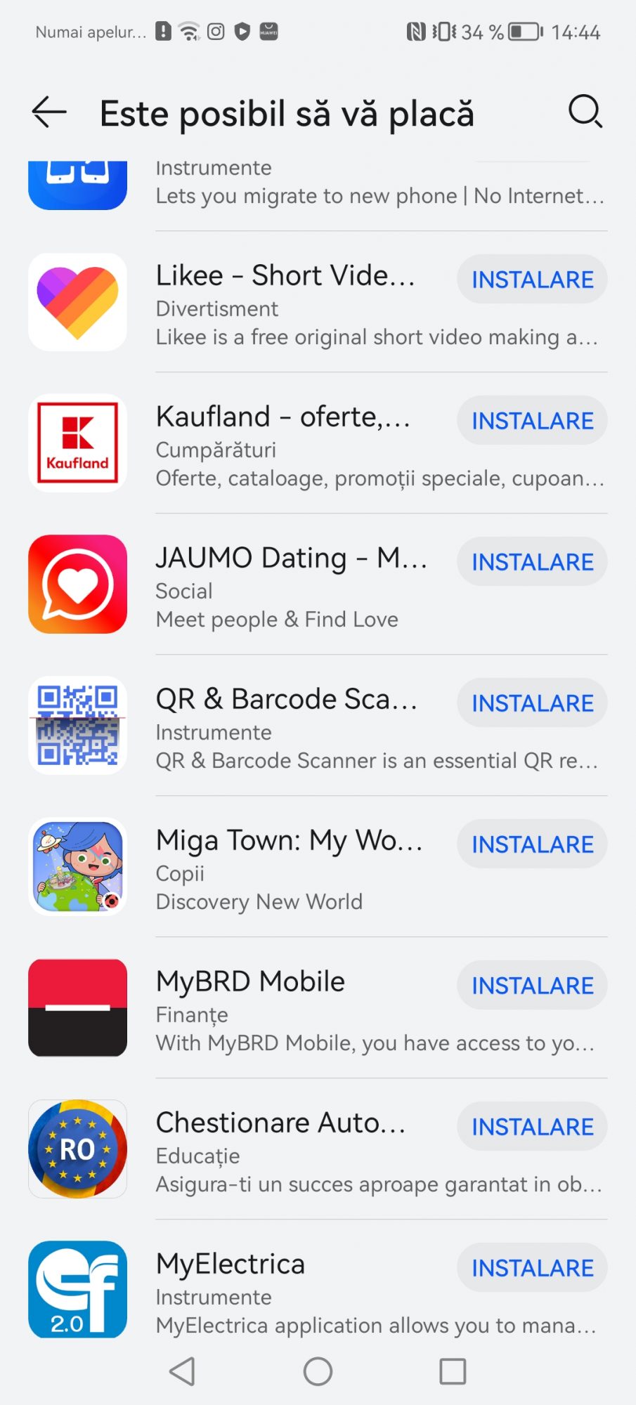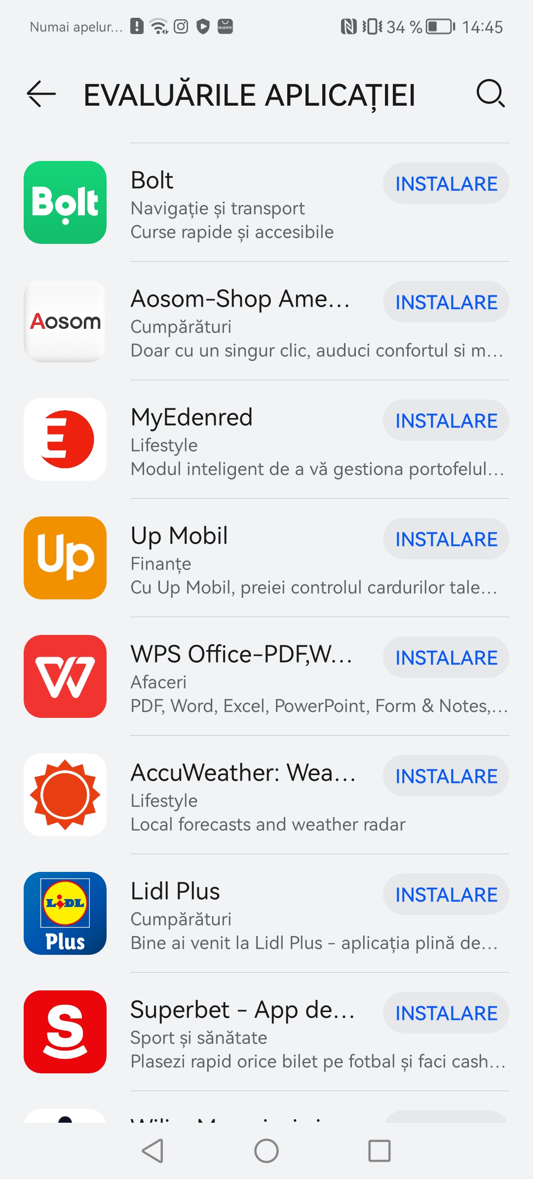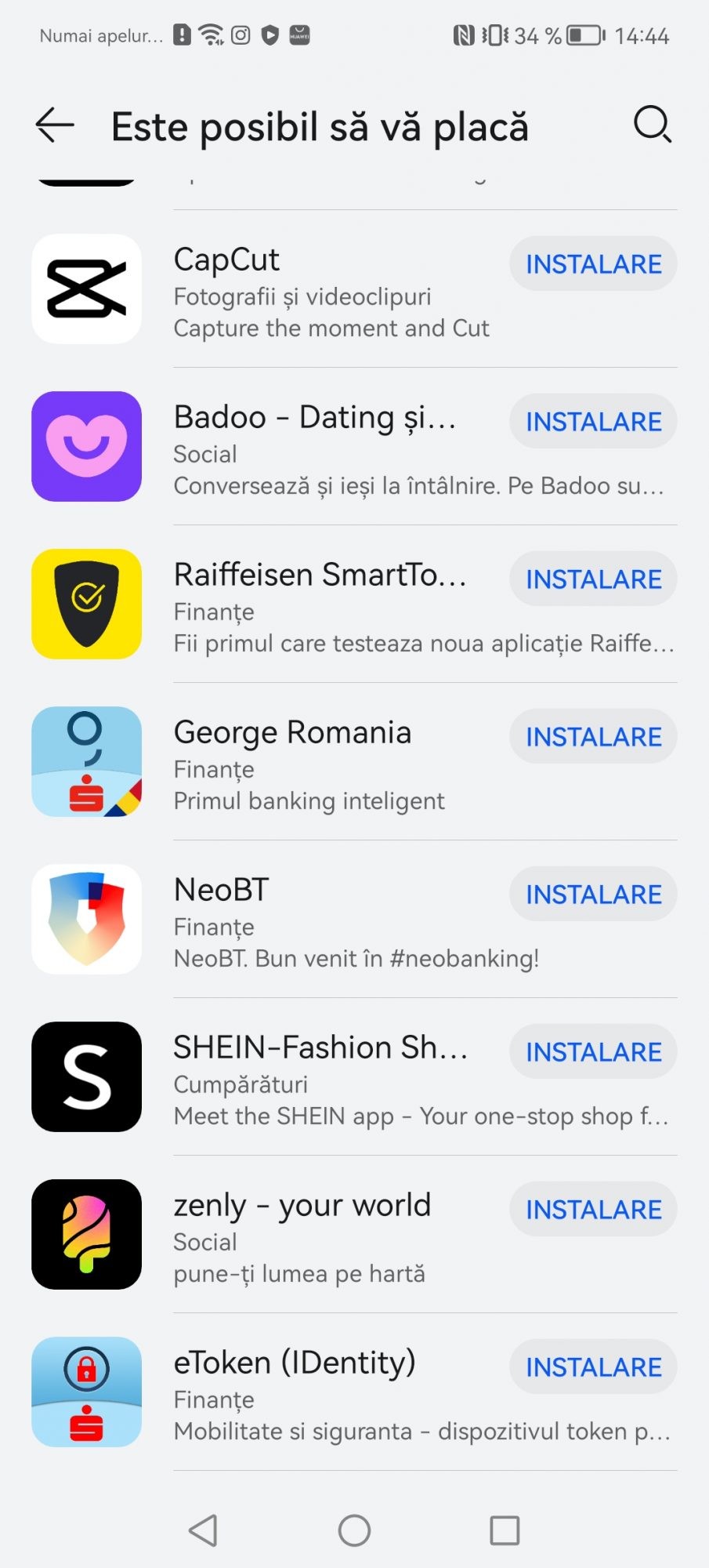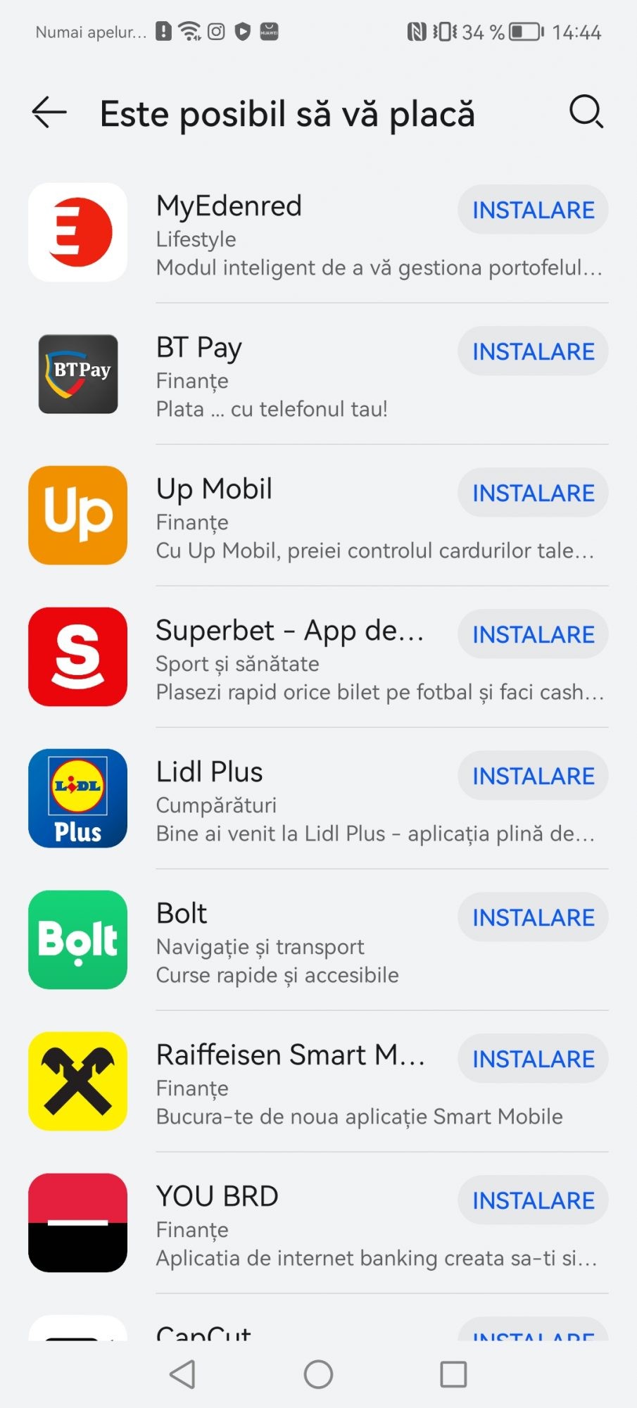 Prima solutia si cea oficiala este AppGallery. Este magazinul lor propriu si personal de aplicatii. Au lucrat aproape cu dezvoltatorii locali de aplicatii ca sa ofere nativ cele mai populare servicii pe telefoanele Huawei. Gasiti aplicatii precum Best Jobs, eToken, Raiffeisen Smart, ePantofi, MyVodafone, Moovit, Kaufland si inca multe altele. O sa va pun print screen ca sa nu le enumar pe toate.