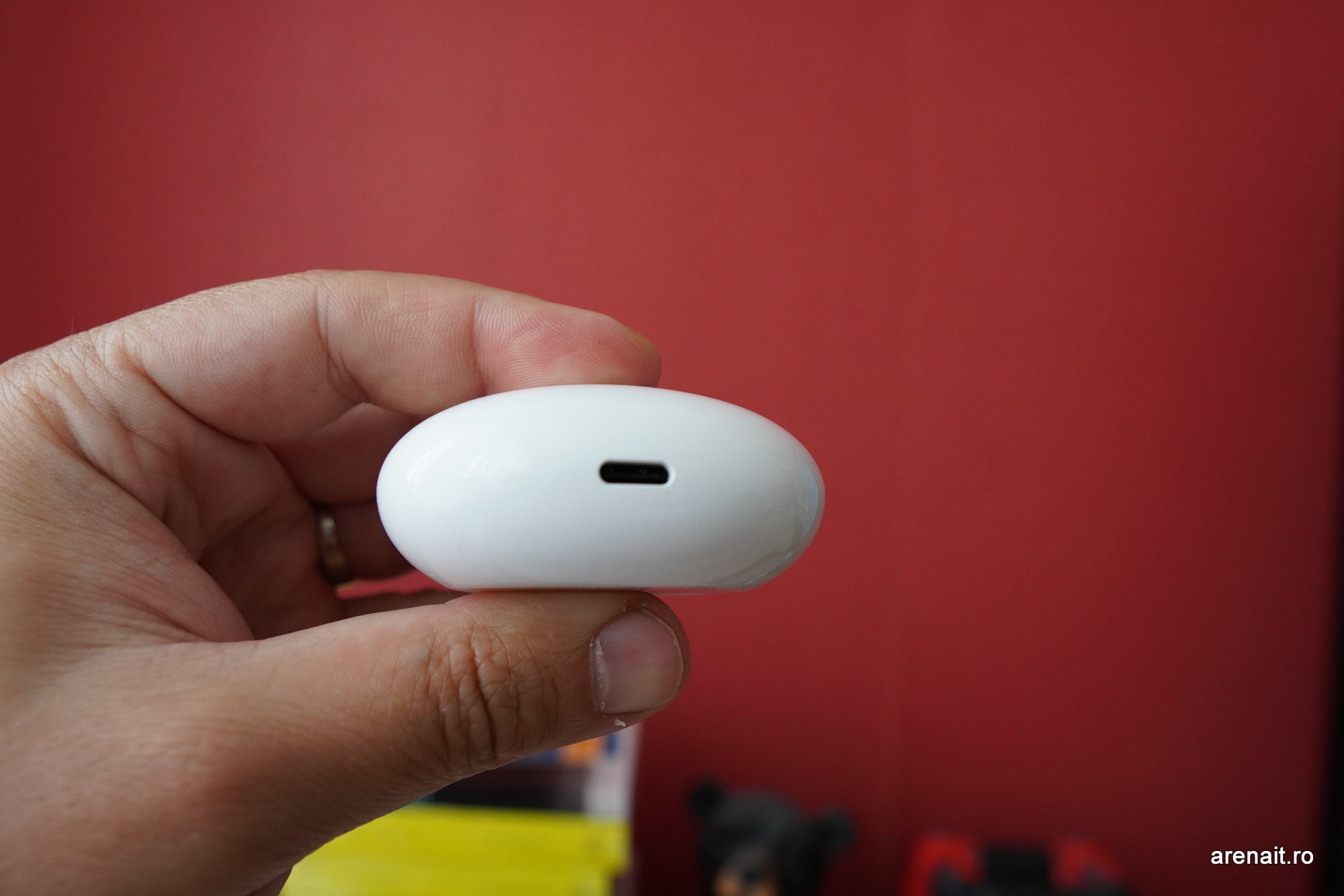 În cutie găsim căștile și cutia de transport și încărcare, un cablu USB -> USB-C și două vârfuri de silicon (S și L, pe lângă cele de mărime M instalate), pe lângă câteva manuale și cărticele.