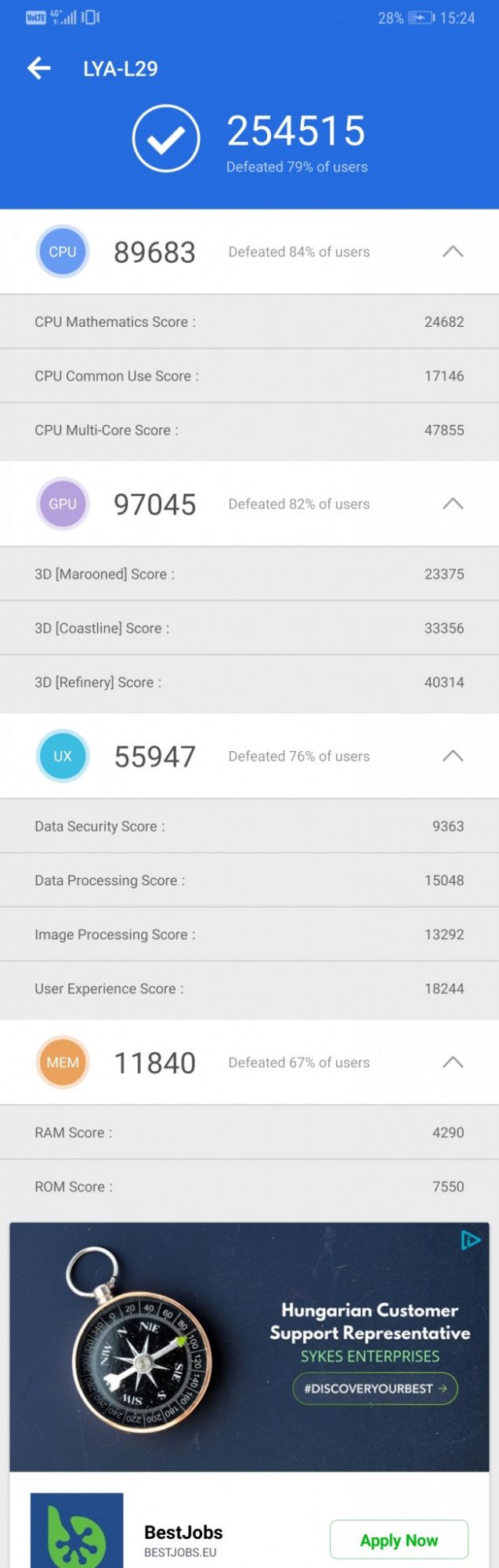 Performante. Testele sintetice din GeekBench arata rezultate similare cu Note 9 (Exynos si 6GB Ram), dar semnificativ mai bune decat LG G7 ThinQ in single-core cel putin. In Antutu, Mate20Pro a reusit un scor de 254.000, comparativ cu cel de 240.000 pe Note 9 testat de mine. La fel ca in cazul DxOMark, nu puneti in balanta exagerat de mult testele sintetice, ci performanta zilnica. Nu are sens sa il comparam cu Apple A12 care este mult mai rapid.