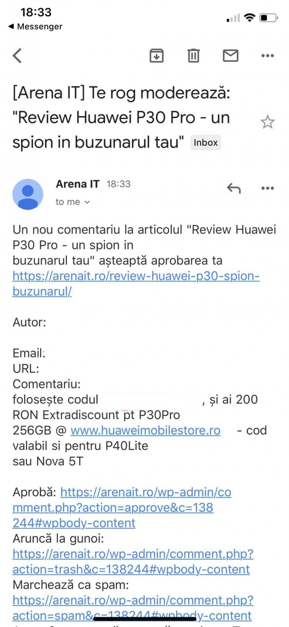 Cele 3 comentarii au fost lasate de aceeasi persoana, insa am sters informatiile sensibile din motive evidente. Am incercat sa iau legatura cu Huawei Romania pe Facebook, iar pe scurt nu am primit nici un raspuns. Pur si simplu am fost lasat in seen. Am trecut peste chiar daca tot in aceeasi zi am vazut pe anumite grupuri de Facebook postari similare.