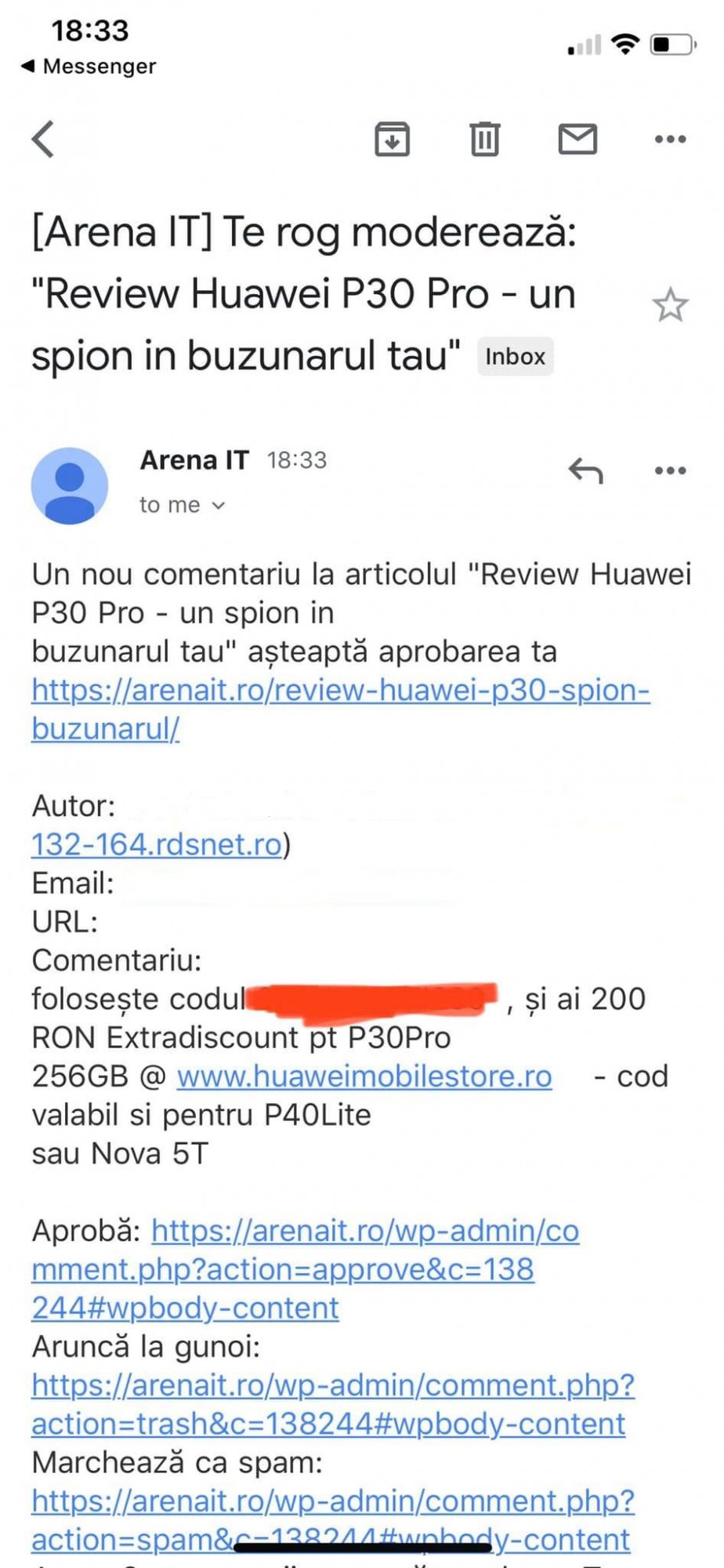 Voi ce parere aveti? Sunteti de acord cu aceasta metoda de promovare? O considerati spam? Am incercat sa iau legatura cu Huawei ca sa ma lamureasca ei despre ce este vorba, nu am reusit.