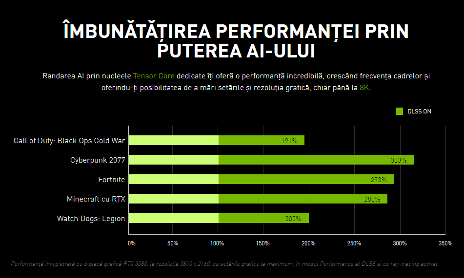 DLSS-ul este o tehnologie de upscaling bazata pe AI, ceea ce inseamna ca daca tu ai un joc care iti merge foarte greu, la modul 30FPS cu detalii grafice medii, poti juca acelasi joc cu 70-80FPS si aceleasi detalii grafice doar folosind DLSS-ul. Nu o sa vezi nici o diferenta de calitate ci doar un plus pe partea de FPS.