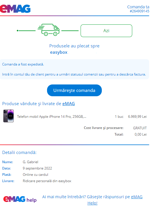 14 Pro este in drum spre Easybox, bucurie mare caci s-au tinut de cuvant si azi mi-l livreaza cei de la eMAG. Este poate cea mai rapida lansare din cate am vazut. In doar o saptamana de la marele eveniment din SUA, telefonul este in Romania si gata sa fie comandat.