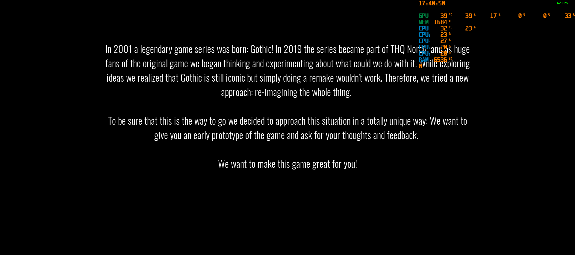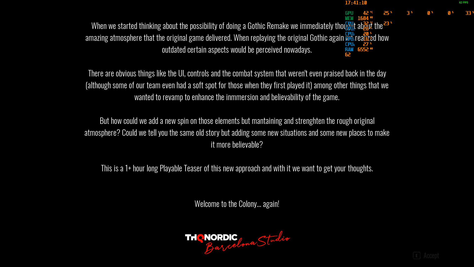 Primele doua jocuri din serie sunt dupa mine cult classics care trebuie jucate de absolut orice gamer si ma bucur ca inca mai am Cd-urile cu Gothic 1 full oferite de raposata revista Level. La 18 ani de la lansarea primului joc, THQ Nordic pare ca doreste sa readuca seria in interesul gamerilor si de nicaieri au lansat un teaser demo jucabil a ceea ce ei doresc sa fie renasterea seriei. Este gratuit si poate fi descarcat de oricine detine un cont de Steam si un titlu Gothic in palmares. Eu l-am descarcat si l-am jucat putin (mai jos aveti secvente de gameplay din sesiunea mea).