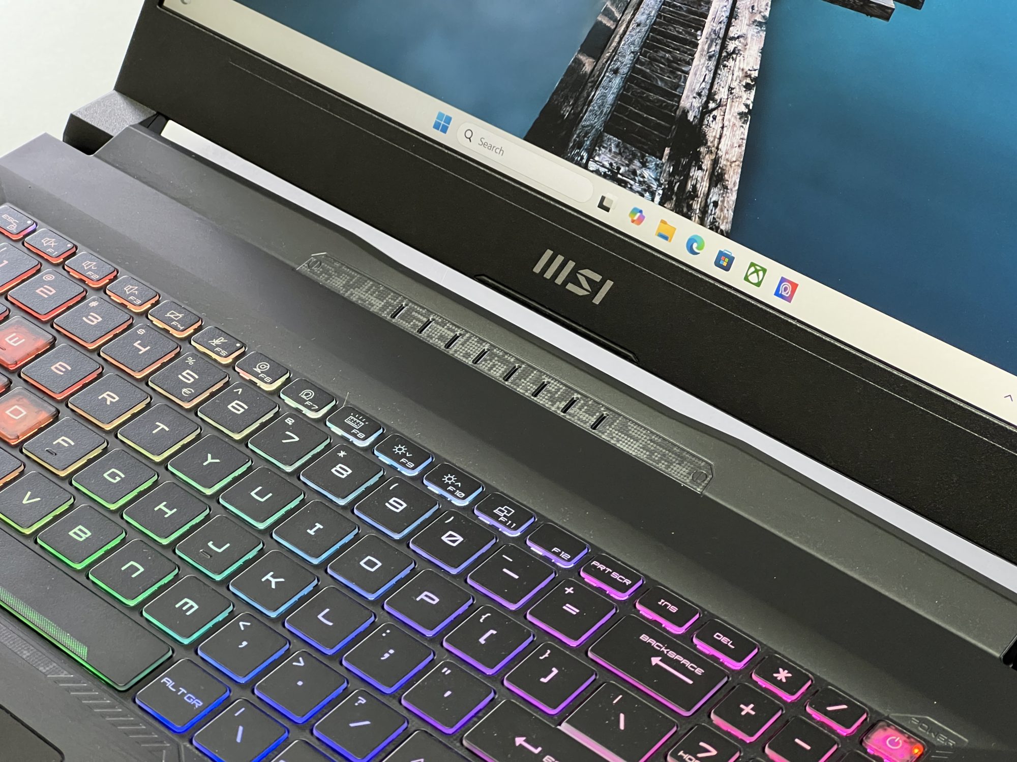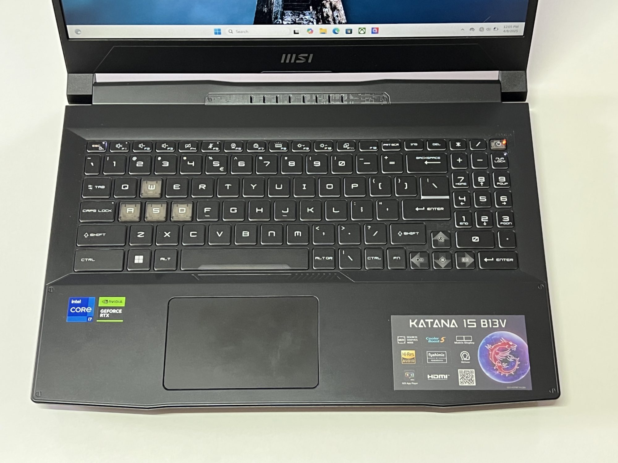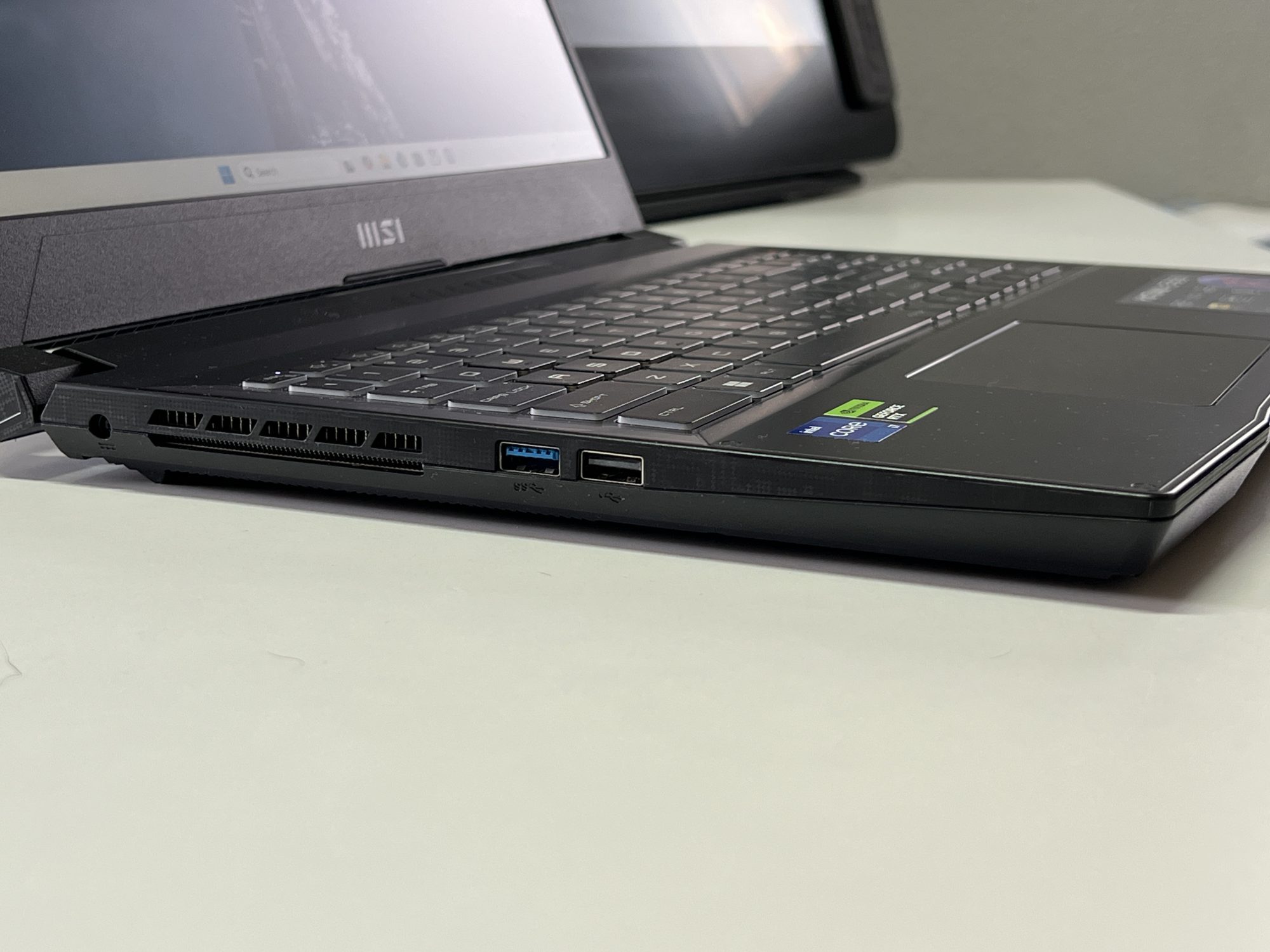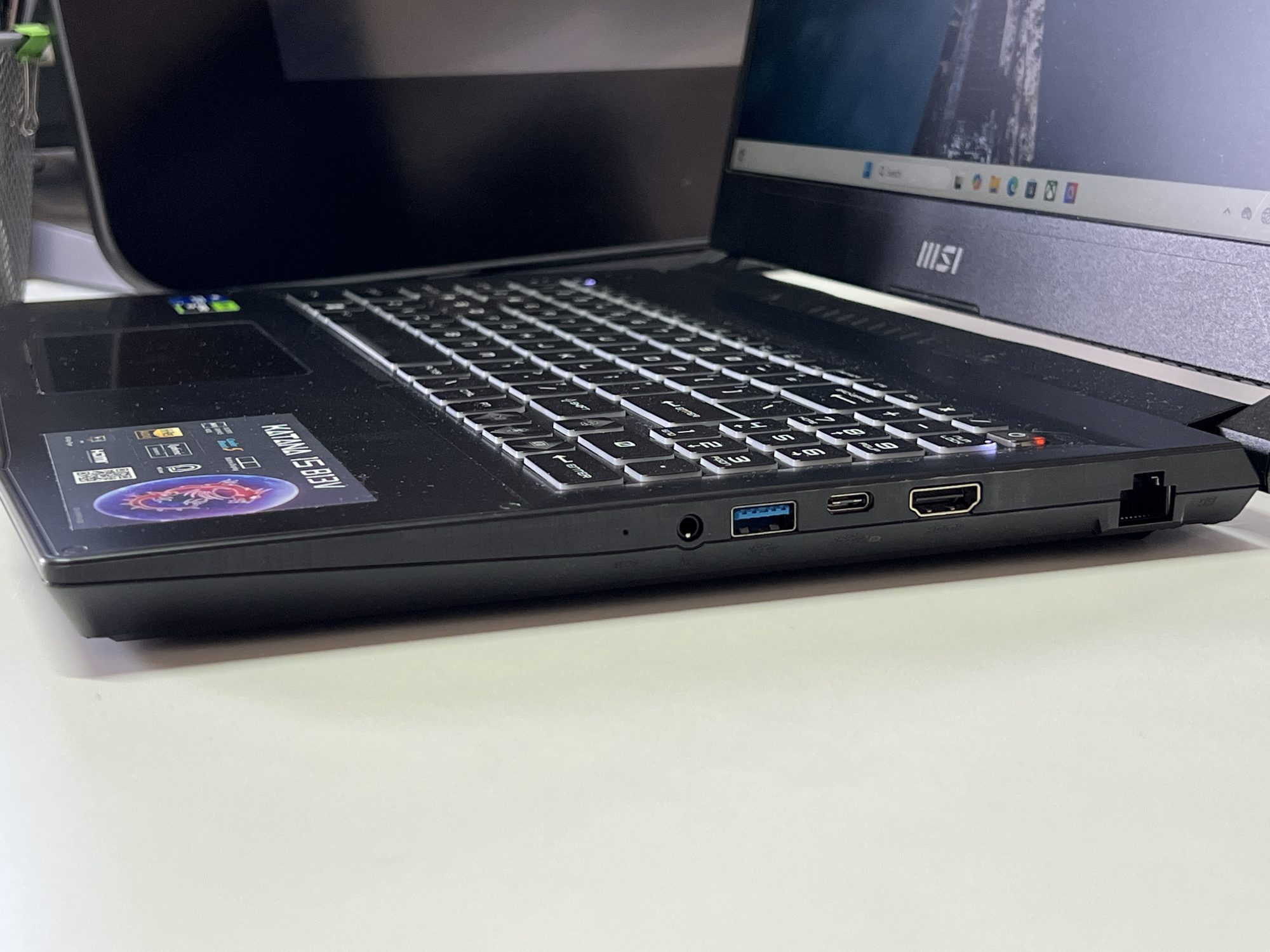 Designul Katana 15 rămâne în linia clasică a MSI. Un aspect sobru, dar cu accente de gaming discrete, potrivit atât pentru birou, cât și pentru LAN party-uri. Tastatura iluminată RGB pe o zonă este un plus pentru sesiuni nocturne, iar construcția, deși din plastic, pare solidă și bine închegată.