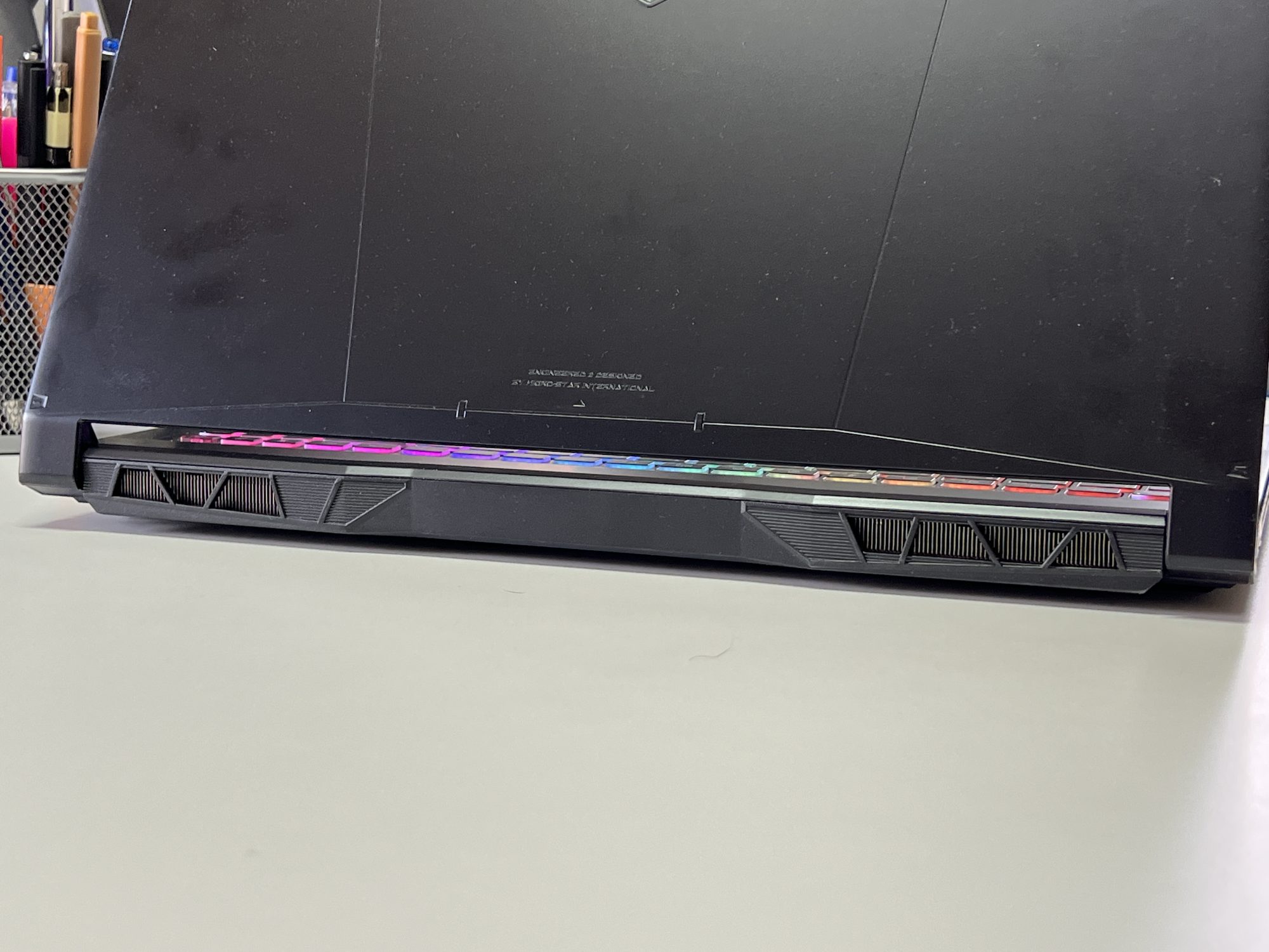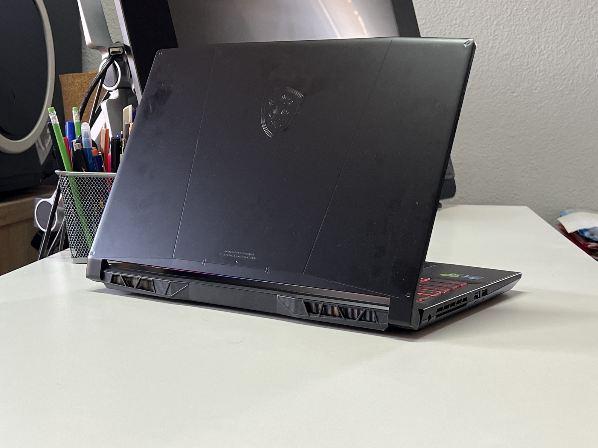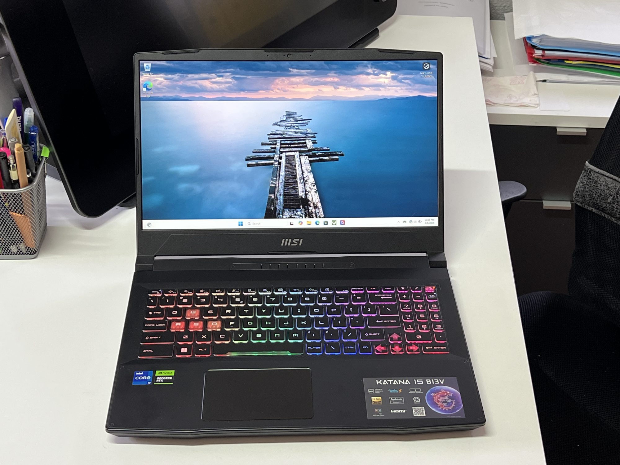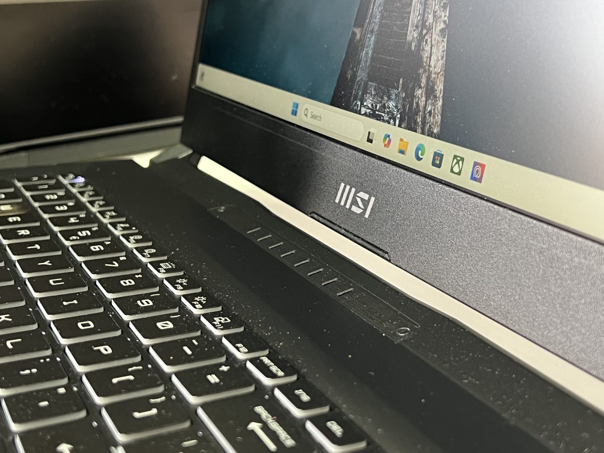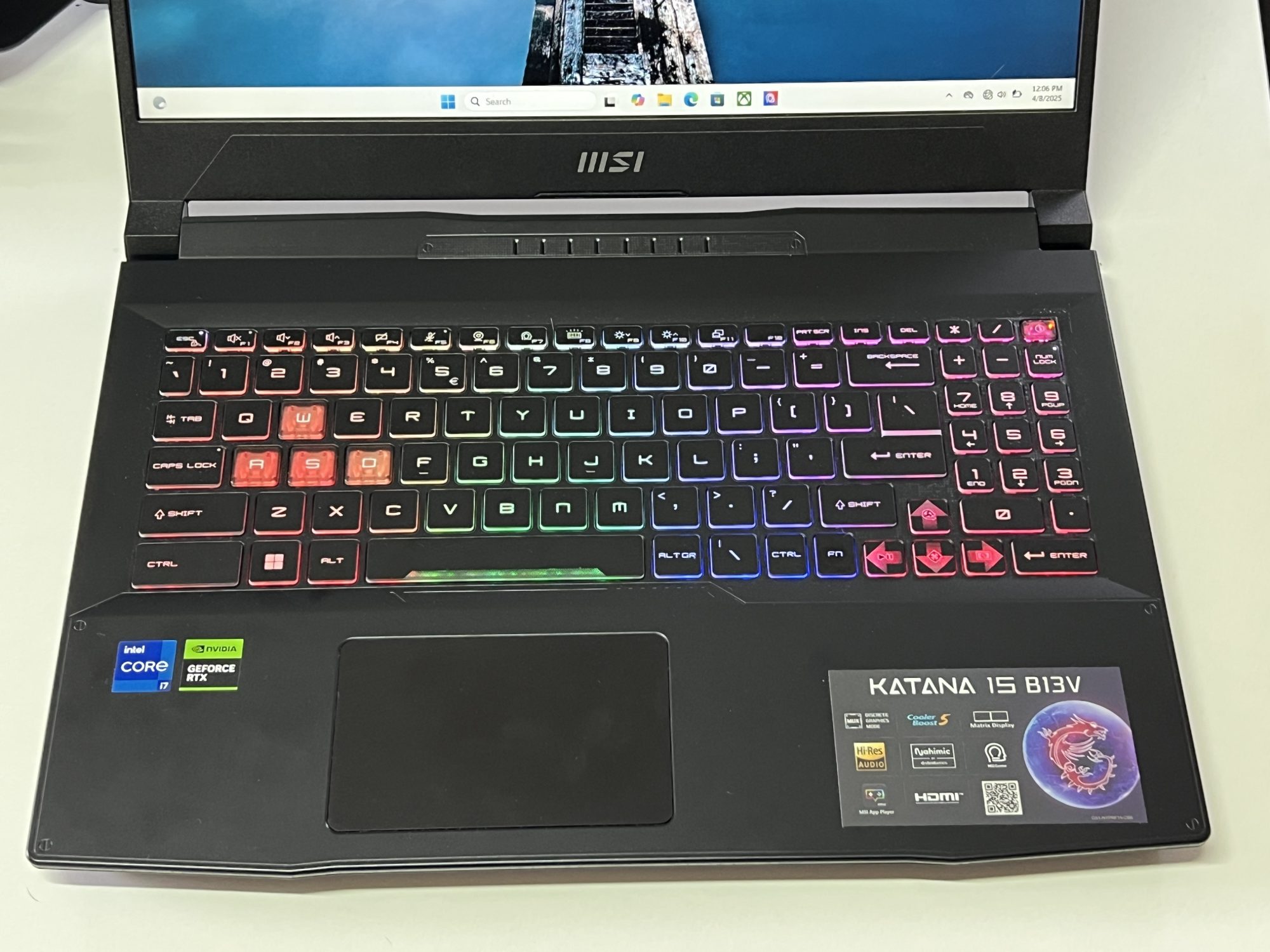 Designul Katana 15 rămâne în linia clasică a MSI. Un aspect sobru, dar cu accente de gaming discrete, potrivit atât pentru birou, cât și pentru LAN party-uri. Tastatura iluminată RGB pe o zonă este un plus pentru sesiuni nocturne, iar construcția, deși din plastic, pare solidă și bine închegată.