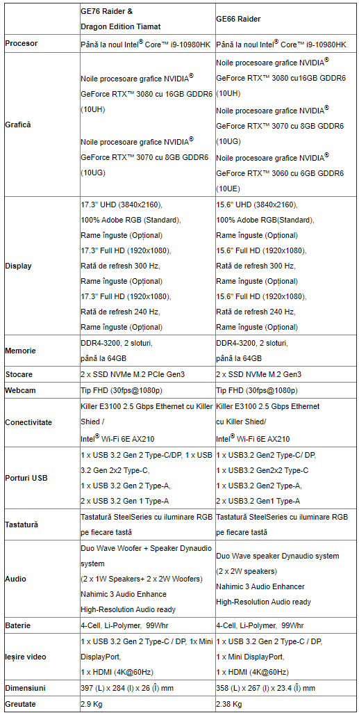 Seria GE Raider ofera un design elegant, iluminare Mystic Light, performante de top si placi video din seria RTX 3000 inclusiv RTX 3080. Vom regasi procesoare i9, Wi-Fi 6 si sistem de racire MSI Cooler Boost 5 format din 6 conducte de caldure cu 2 ventilatoare.