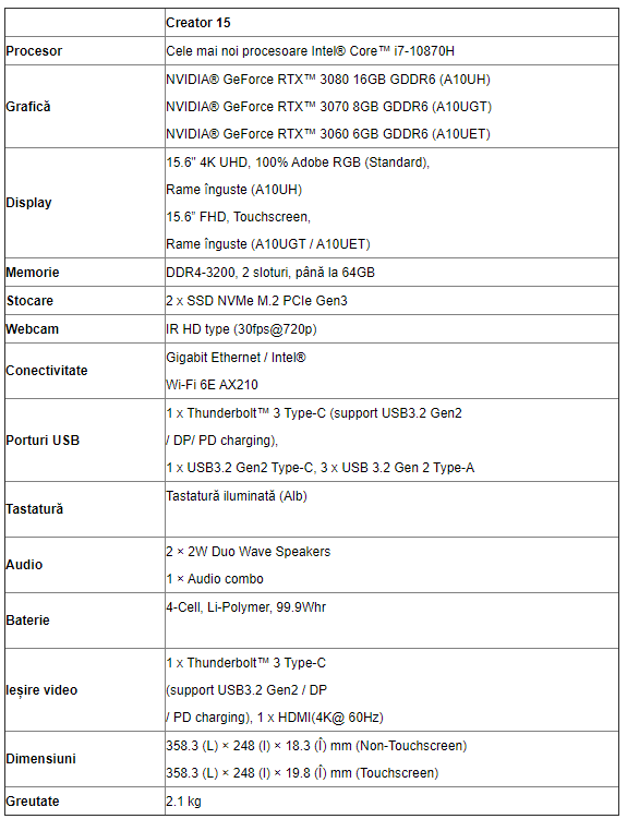 Creator 15, un laptop universal cu panou True Pixel, conceput special pentru cele mai exigente creatii si care ofera garantat cea mai realista experienta vizuala. Are un ecran 4K True Pixel calibrat individual, verificat de Calman si un gamut de culoare 100% Adobe RGB. Bateria este de 99Wh.