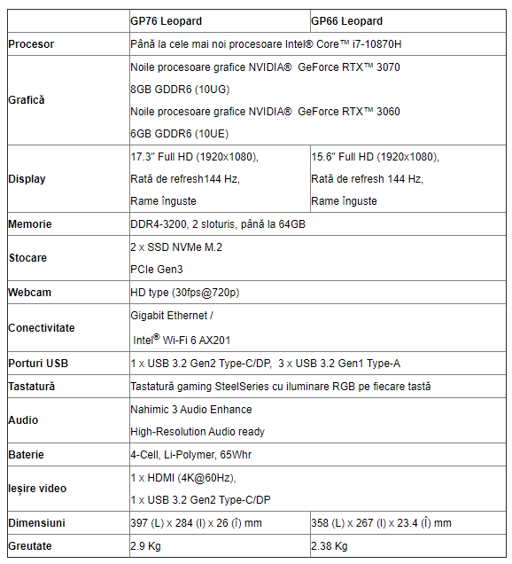 GP66 si GP76 Leopard sunt construite pentru activitățile zilnice, dar și pentru sarcini mai complexe de proiectare. Noul șasiu este elegant și ascunde mai multă putere ca niciodată. GP66 și GP76 Leopard sunt echipate cu grafică GeForce RTX 3080 și cele mai noi procesoare Intel® Core™ i7 pentru a oferi performanțe superioare.