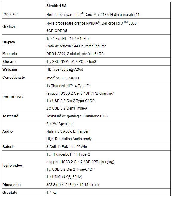 Stealth 15M este cel mai subtire laptop de gaming de 15 inch din lume. Cantareste 1.7kg, masoara 16.15mm grosime, are procesor Intel din seria H din generatia 11 cu o frecventa de pana la 5GHz, placa video RTX 3000.