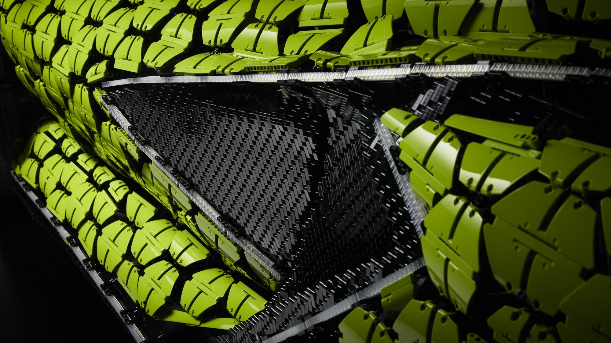 Șasiul cu proporții perfecte este acoperit cu un material realizat din piese LEGO Tehnic hexagonale, personalizate, care sunt conectate pentru a reda caracterul dinamic al carosieriei modelului Lamborghini. Designul aduce un tribut modelului hexagonal, tipic filosofiei de design a Automobili Lamborghini, redând forma hexagonală a farurilor spate și a evacuărilor supercar-ului italian.
