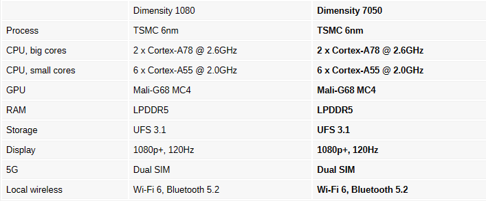 MediaTek a anuntat o noua platforma SoC, similara cu Dimensity 1080 lansata in noiembrie. Noua platforma Dimensity 7050 este realizata la TSMC pe 6nm.