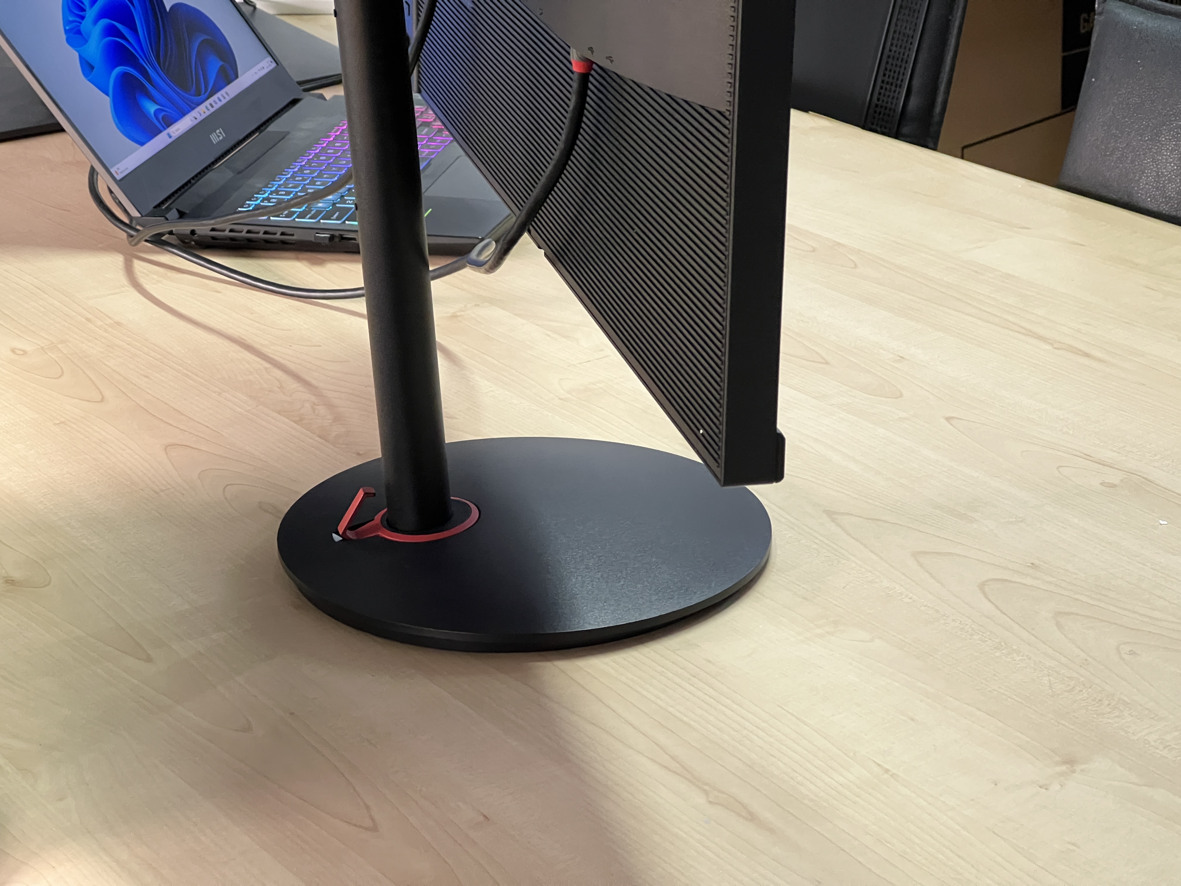 Monitorul vine ambalat intr-o cutie de carton simpla. Nimic fancy aici. Este protejat bine si vine cu piciorul montat, dar cu talpa separata. Se monteaza usor printr-un singur click dupa care strangi un surub.