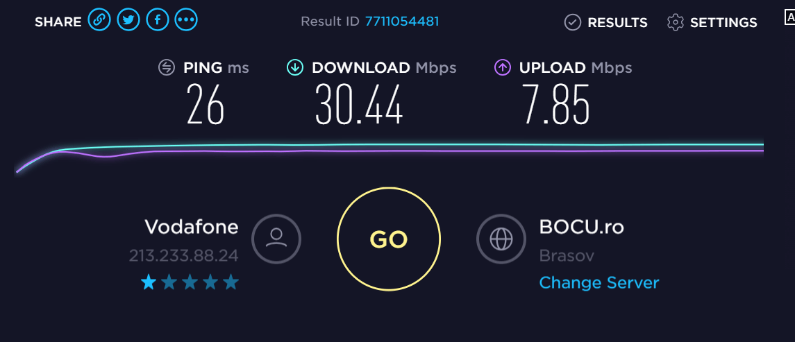 Am folosit routerul alaturi de o cartela Vodafone si am avut conectat la el doua laptopuri si doua telefoane mobile. In timp ce ambele laptopuri redau continut full HD de pe YouTube nici unul din ele nu s-a oprit pentru a incarca continut, iar viteza de navigare pe internet a fost buna. Streamingul de continut a functionat impecabil si am jucat cateva meci-uri de Call of Duty Black Ops II fara probleme. Am atasat mai jos rezultatele de pe Speedtest, care nu se apropie de vitezele teoretice specificate de producator, dar este mai mult vina SIM-ului. L-am incercat si cu o cartela Telekom iar viteza a crescut considerabil.