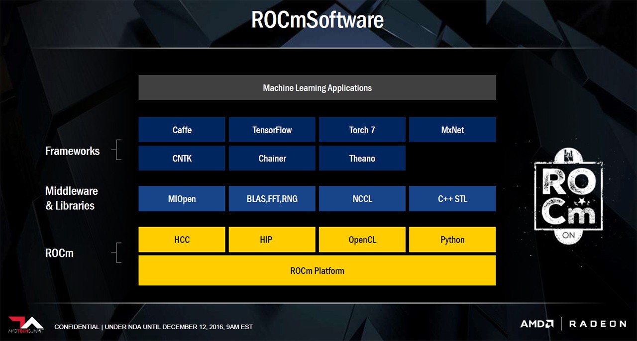 Legat de sofware, Boltzmann Initiative este un program pentru dezvoltatori ce le permite sa controleze nucleele din procesor si placa video. ROCm, o platforma software lansata anul trecut, este special dezvoltat pentru ecosistemul AMD. Acesta poate converti programele CUDA in C++, este compatibil cu OpenCL si Python si contine compilatorul HSA, redenumit HCC.