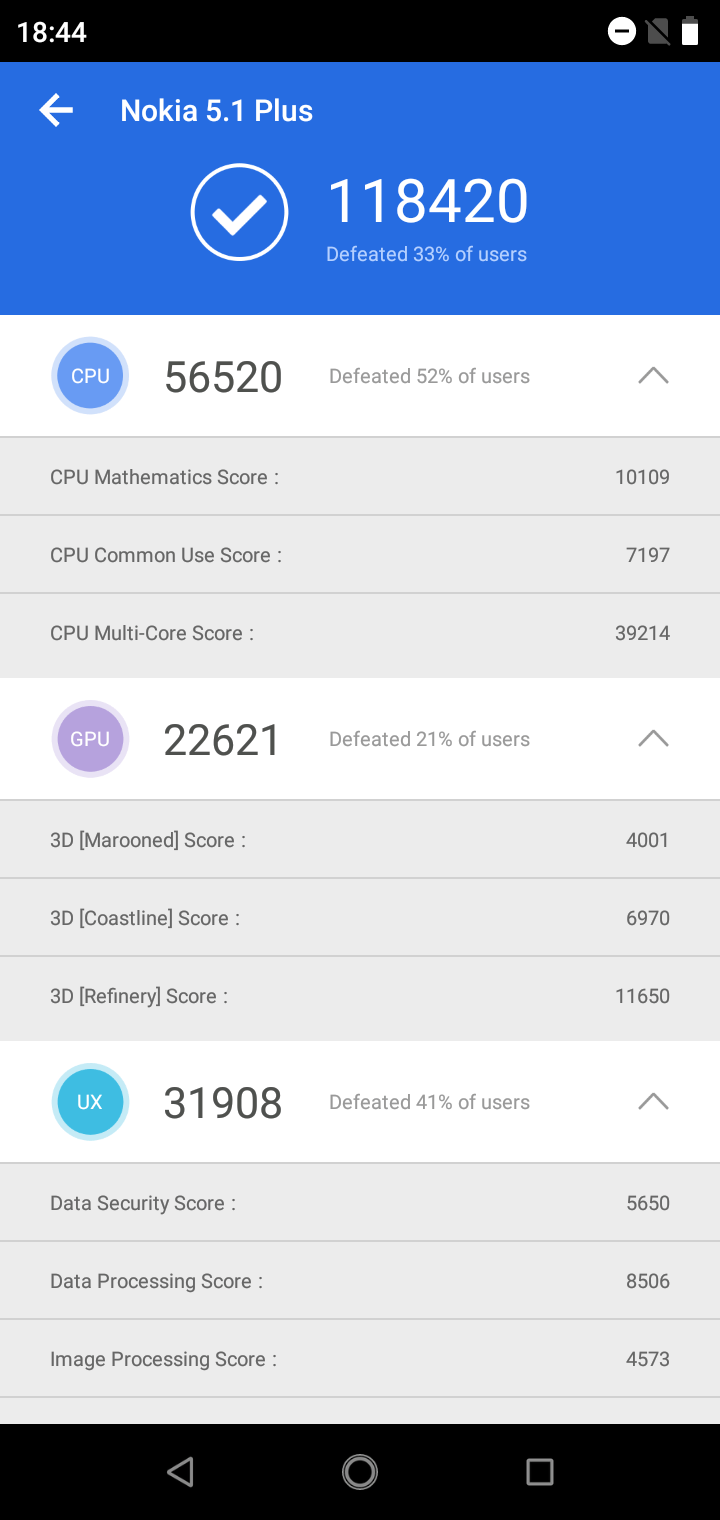 Performante. In Antutu 3D, Nokia 5.1 Plus a obtinut un scor cu 28.000 de puncte mai bun decat cel al lui Nokia 6.1 (Snapdragon 630), iar Geekbench 4 am avut dificultati in a-l rula. Conform blog-ului acestora, problema este cunoscuta. In utilizarea zilnica eu nu am observat vreo diferenta de performanta intre 5.1 Plus si 6.1.
