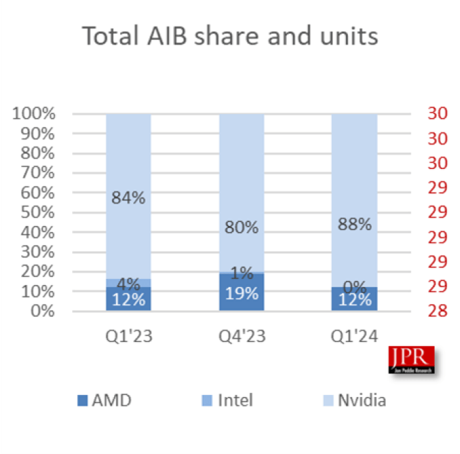 Nu stiu daca mira pe cineva. Nvidia are o cota de piata de 88%, iar AMD doar 12%. Raportul vizeaza primul trimestru din 2024 si a fost realizat de JPR, iar datele arata ca in Q1 2024 s-au vandut mai multe placi video decat in Q1 2023.