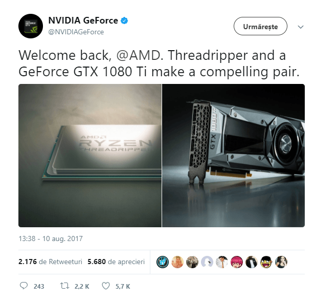 Da , e o ironie . Credeti ca AMD n-ar fi vrut sa-si insoteasca Threadripperul cu o placa video pe masura ? Dar n-are ! 🙂 Completarea mesajului se subintelege : ” Un procesor mai bun pentru a face echipa cu inegalabila nostra GeForce GTX 1080 Ti , cea mai puternica placa video de gaming din lume . Tineti-o tot asa , ca ne place situatia ! ” 🙂