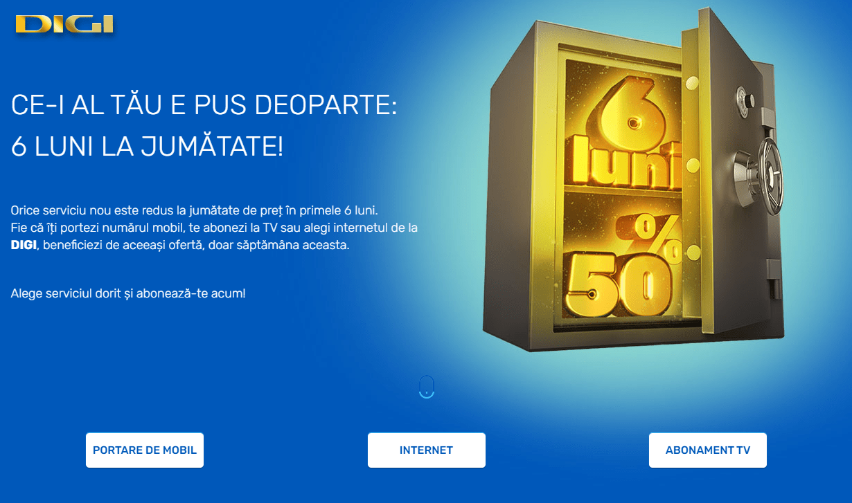 Digi are o noua campanie unde ofera 6 luni de abonament redus cu 50%. Oferta este valabila de ieri si tine pana pe 4 iulie 2021.