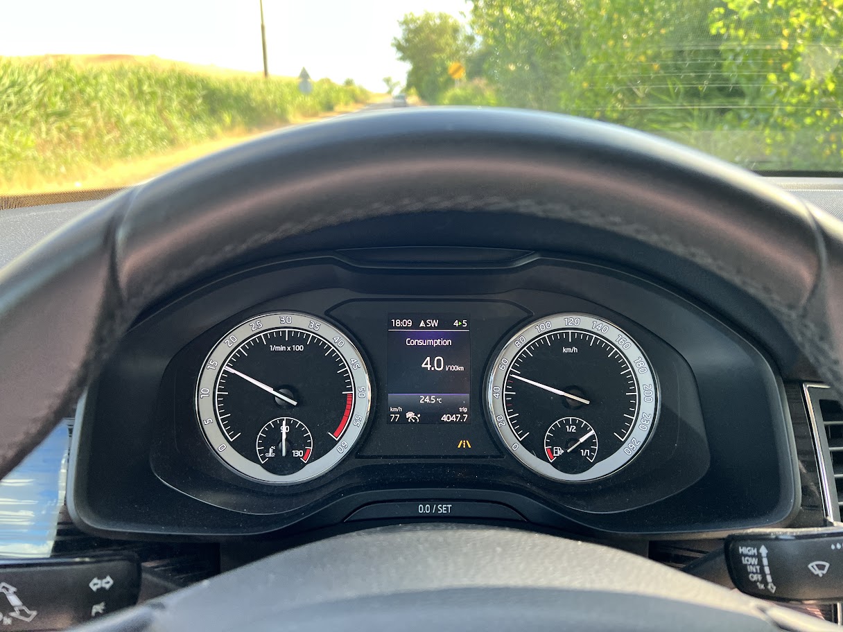 Pe autostradă, sau pe alte drumuri, dar drepte, fără întreruperi, este indicat să folosești pilotul automat, care este corelat și cu Lane Assist. Asta dacă vrei să salvezi combustibil și nu faci raliuri pe șosea. Doar că asemenea comportament este cam greu de realizat prin România, după cum se vede.