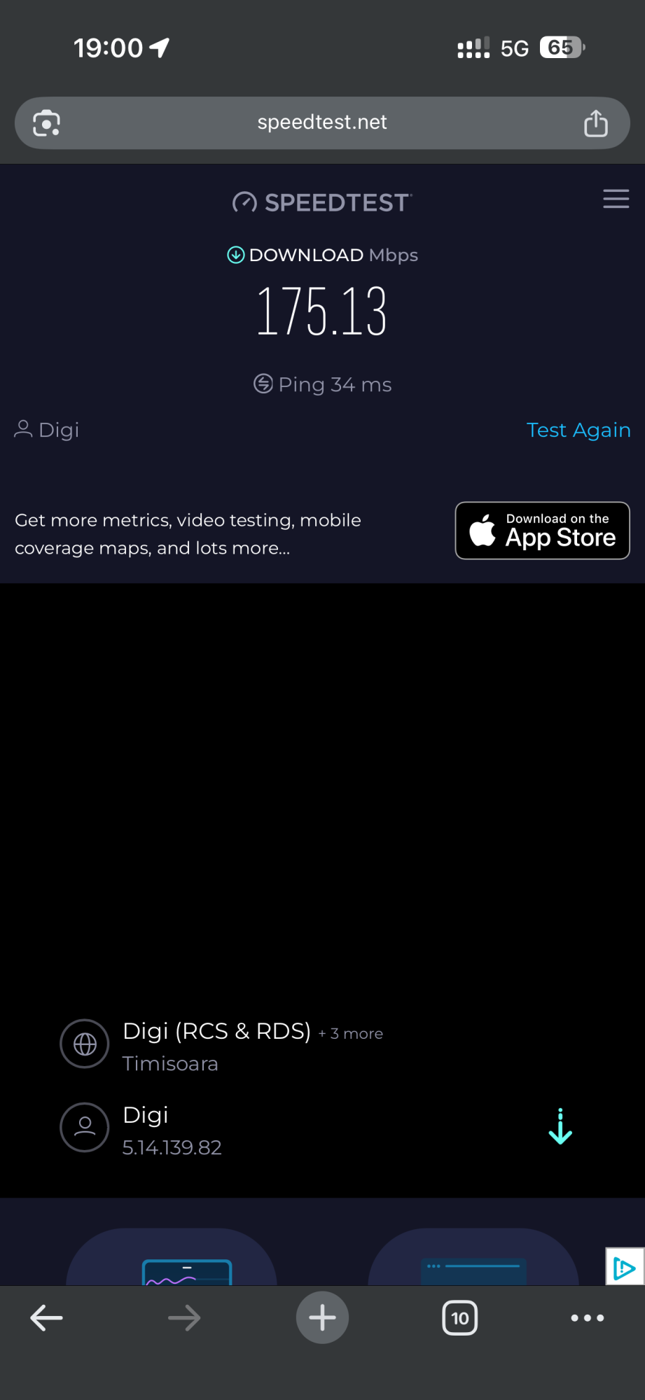 Mai înainte de toate, vă las două capturi de ecran cu testele tulate pe speedtest.org, cunoscutul portal folosit de noi toți. Acestea sunt rulate în aceeași locație, la aproximativ aceeași oră (e o diferență de 30 de minute, pentru că, între ele, am mers la un control medical) și de pe același telefon: