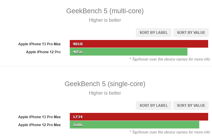 AnTuTu a testat un iPhone 13 Pro cu 6GB RAM si 1TB stocare si a obtinut un scor de 840.000 puncte. Pe scurt, iPhone 13 Pro are un GPU cu 19% mai performant decat iPhone 12 Pro, iar CPU-ul este cu 17% mai performant.