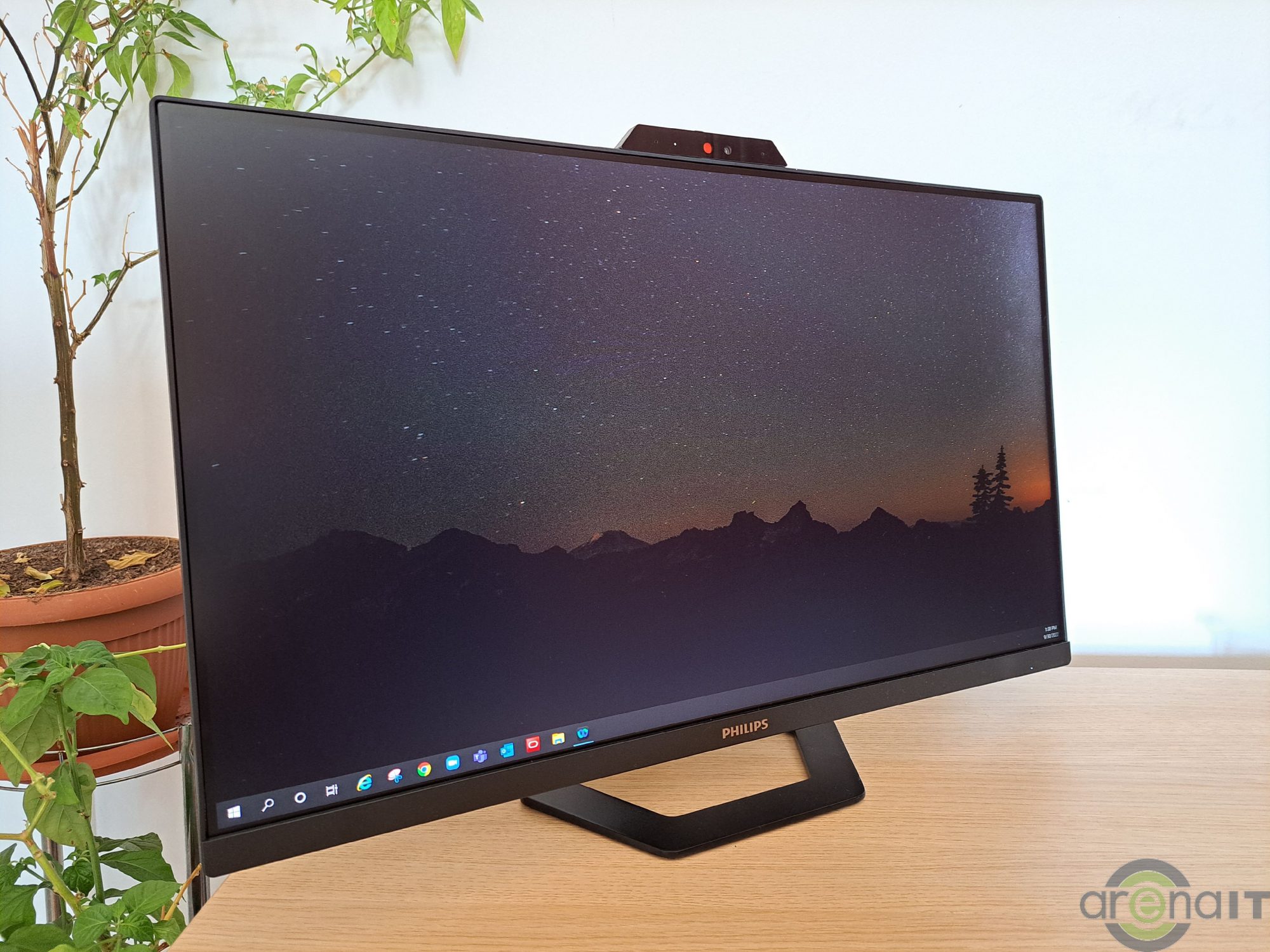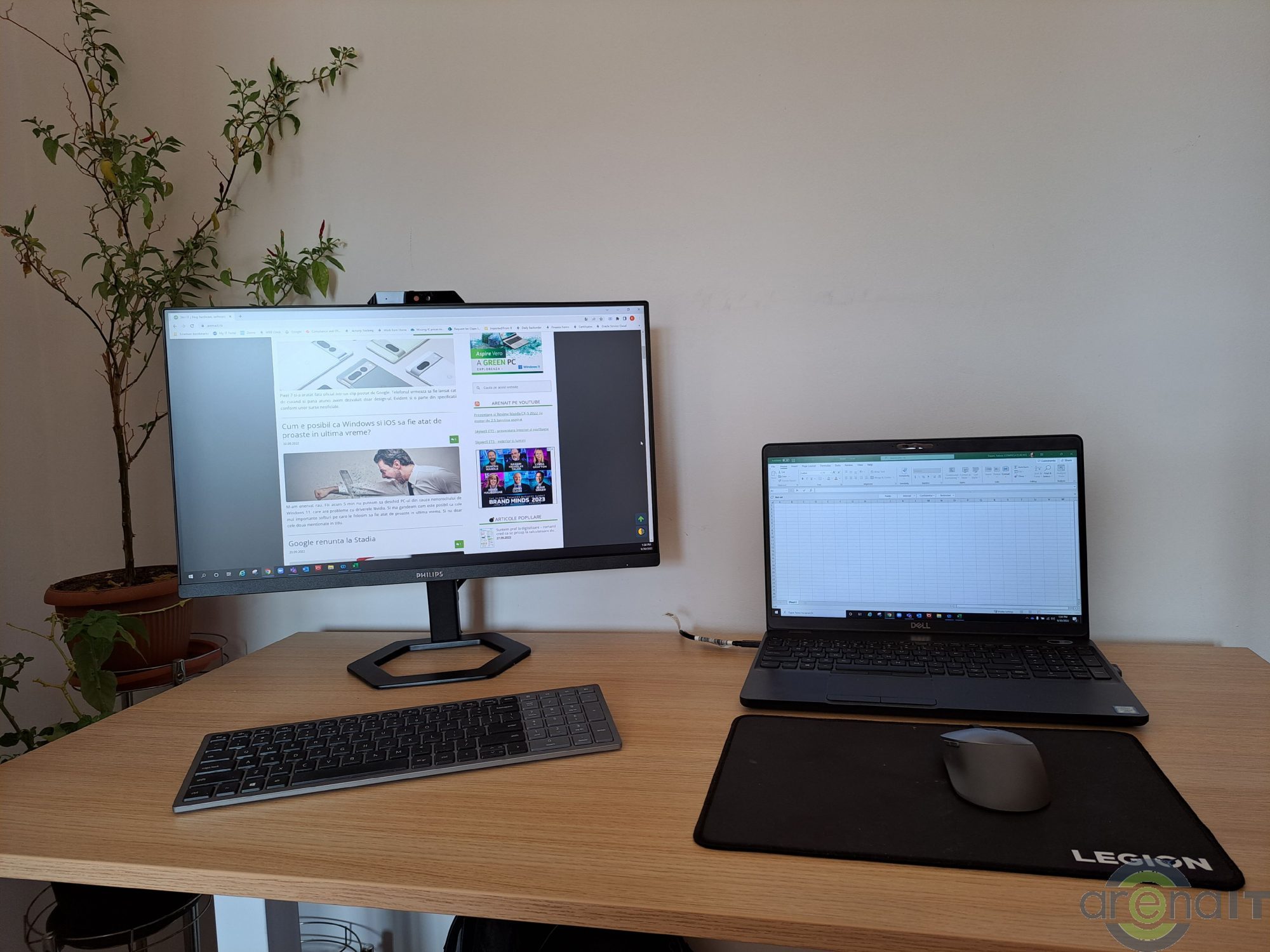 De dragul testarii, am lucrat cateva zile din cealalta camera si pe un setup diferit: am folosit laptopul si un monitor oferit in teste de Philips, anume un 24E1N5300HE cu webcam integrat.