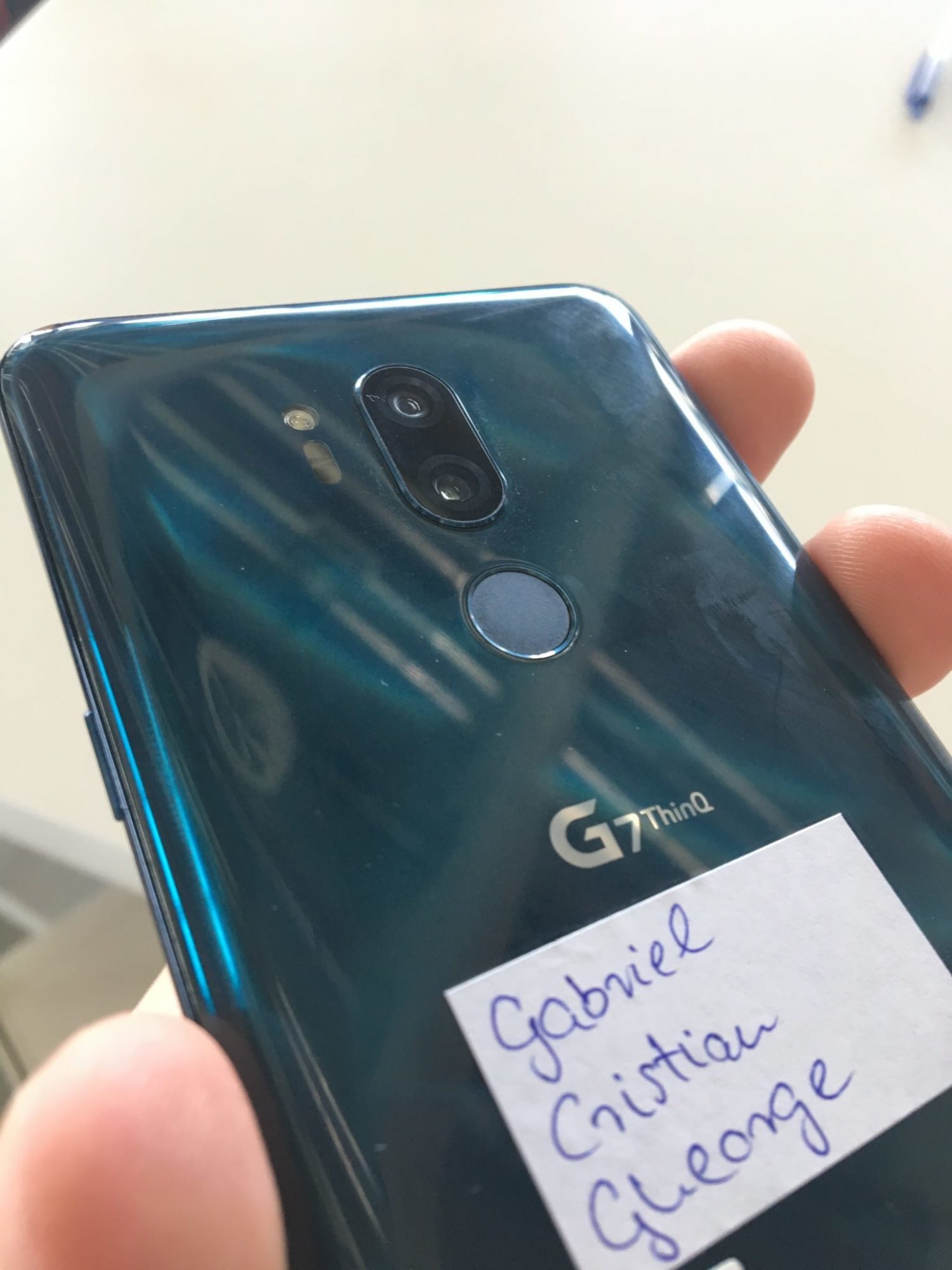 LG G7 este construit din sticla in totalitate asa cum am vazut ca este moda pentru anul 2018. Eu am avut un model verde foarte frumos, insa ca orice alt telefon cu spate din sticla amprentele se depun imediat.
