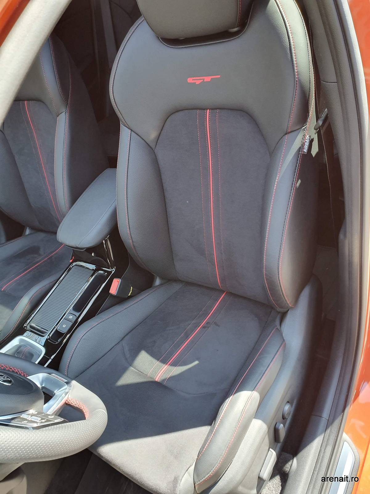 Interior. Din nou, si la interior, pot sa spun ca rezultatul e unul mai mult decat placut. Mi-a placut foarte mult volanul, bordul si forma scaunelor. Materialele folosite sunt unele de buna calitate aproape peste tot. Am avut si la interior senzatia de aglomerare de culori mai ales la fetele de usi, unde avem negru lucios, negru mat, argintiu si rosu, toate in aceeasi zona.