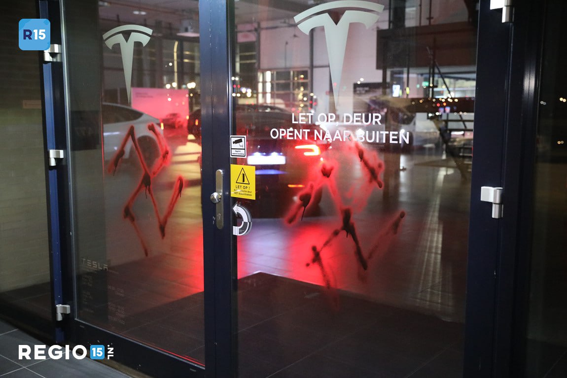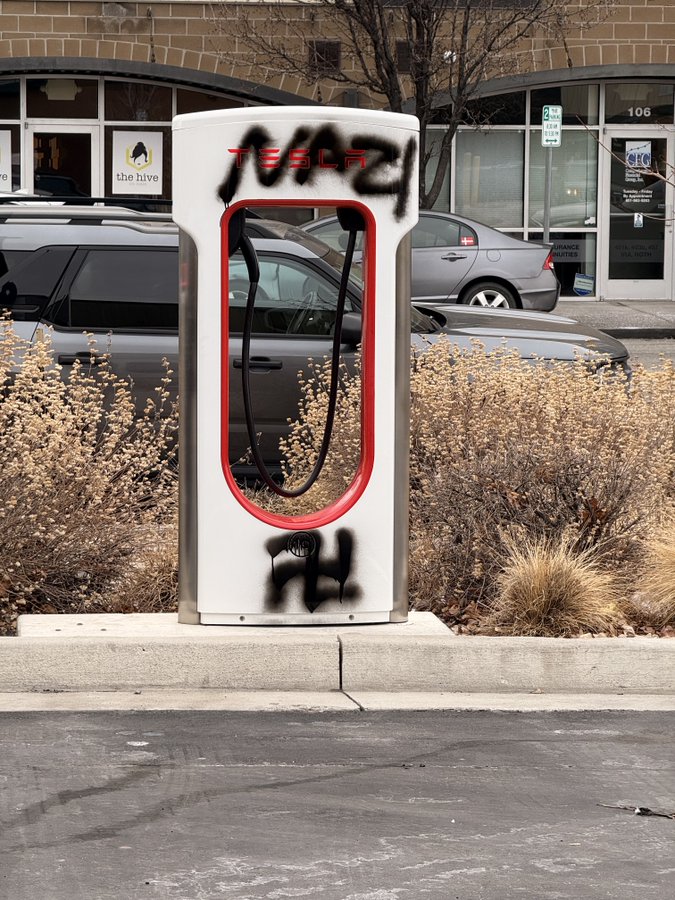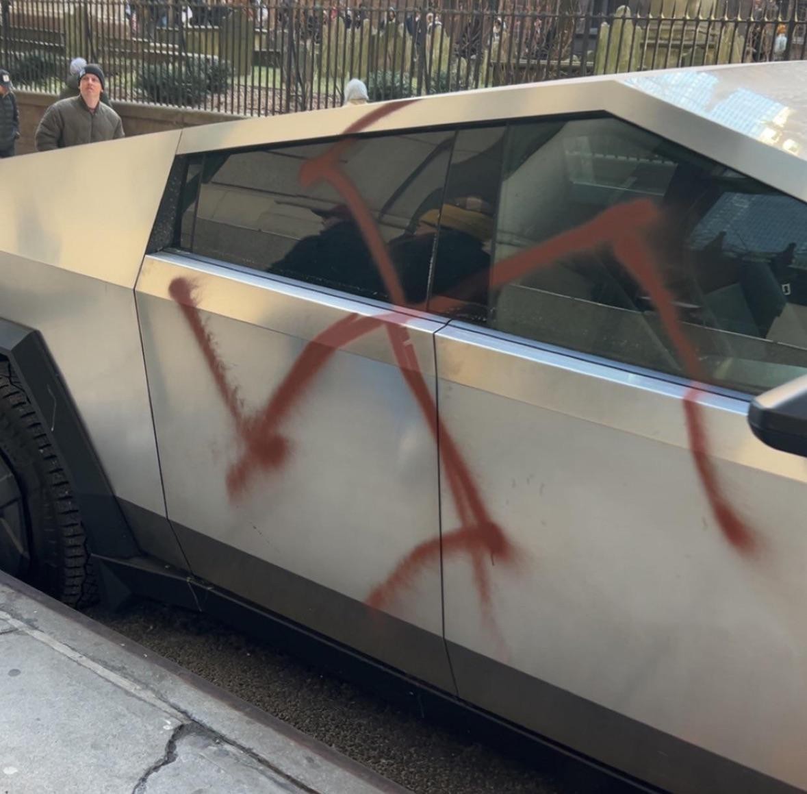 Si aici parca nici nu vreau sa discutam despre vandalism si violenta, pentru ca asta reprezinta acele acte in care niste indivizi au vopsit cu un spray cate o zvastica pe un Tesla SuperCharger, o masina sau un showroom. Nu pot sa validez vandalismul ca o metoda de exprimare, desi trebuie sa recunosc ca exprima un mesaj puternic. Dar chiar si asa, sa vandalizezi un bun privat (cum e masina cuiva) doar pentru ca CEO-ul e un dobitoc, nu mi se pare nici corect nici eficient. In fine, acestea de mai jos sunt doar cateva exemple, ca pe internet gasim mult mai multe.