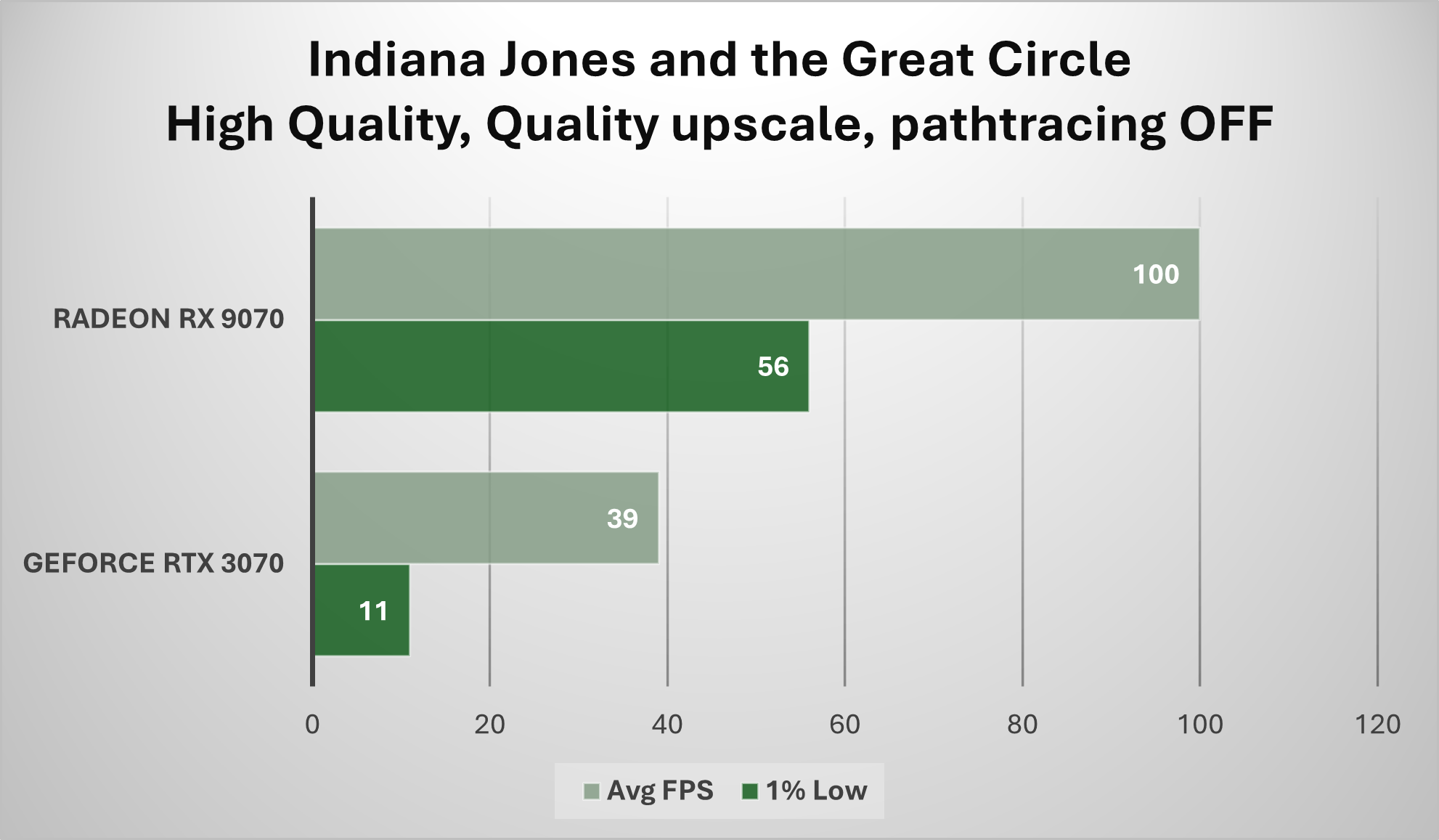 Observatii: Indiana Jones nu va rula pe o placă video fără suport ray tracing, însă adevăratul deliciu vizual al jocului vine de la path tracing. Acesta îngenunchează 9070 și momentan nu este nici stabil. Am avut 9 tentative de a activa frame generation si de fiecare data s-a blocat. Un viitor driver ar putea rezolva problema încât este cunoscută de AMD.