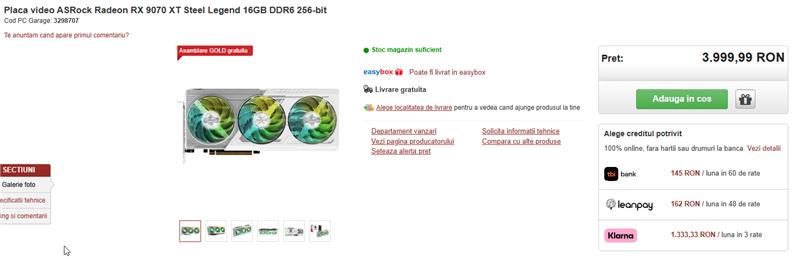 M(ă) S(imt) R(elativ) P(ăcălit), ca să nu zic prost, sau MSRP-ul pentru AMD Radeon 9070 este de 550$. Să zicem că punem un TVA rotund de 20% și facem conversia în euro: obtinem 660 euro sau 3285RON. Am văzut la 3460RON cea mai ieftină implementare de la Sapphire, cu stoc la evoMag pe data de 20 Martie. Cele mai scumpe implementări le-am văzut pe la 4000RON în stoc. Și pentru vreo 2 ore au fost 5 bucăți de AS Rock RX 9070 XT la 4000RON la PCGarage.