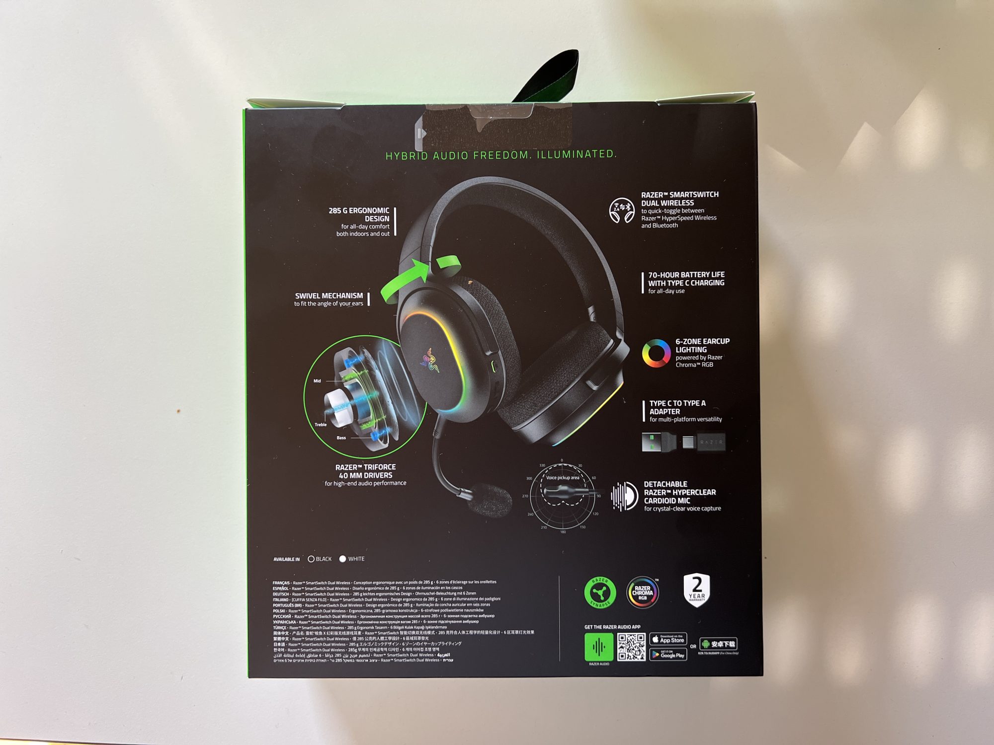 Pachetul include un dongle USB-C pentru conexiuni wireless low-latency, însoțit de un adaptor USB-A, asigurând compatibilitatea cu orice sistem. De asemenea, modelul Chroma adaugă iluminare RGB personalizabilă prin Razer Chroma, oferind un plus de stil și personalitate, deși activarea acestei funcții poate reduce autonomia bateriei.