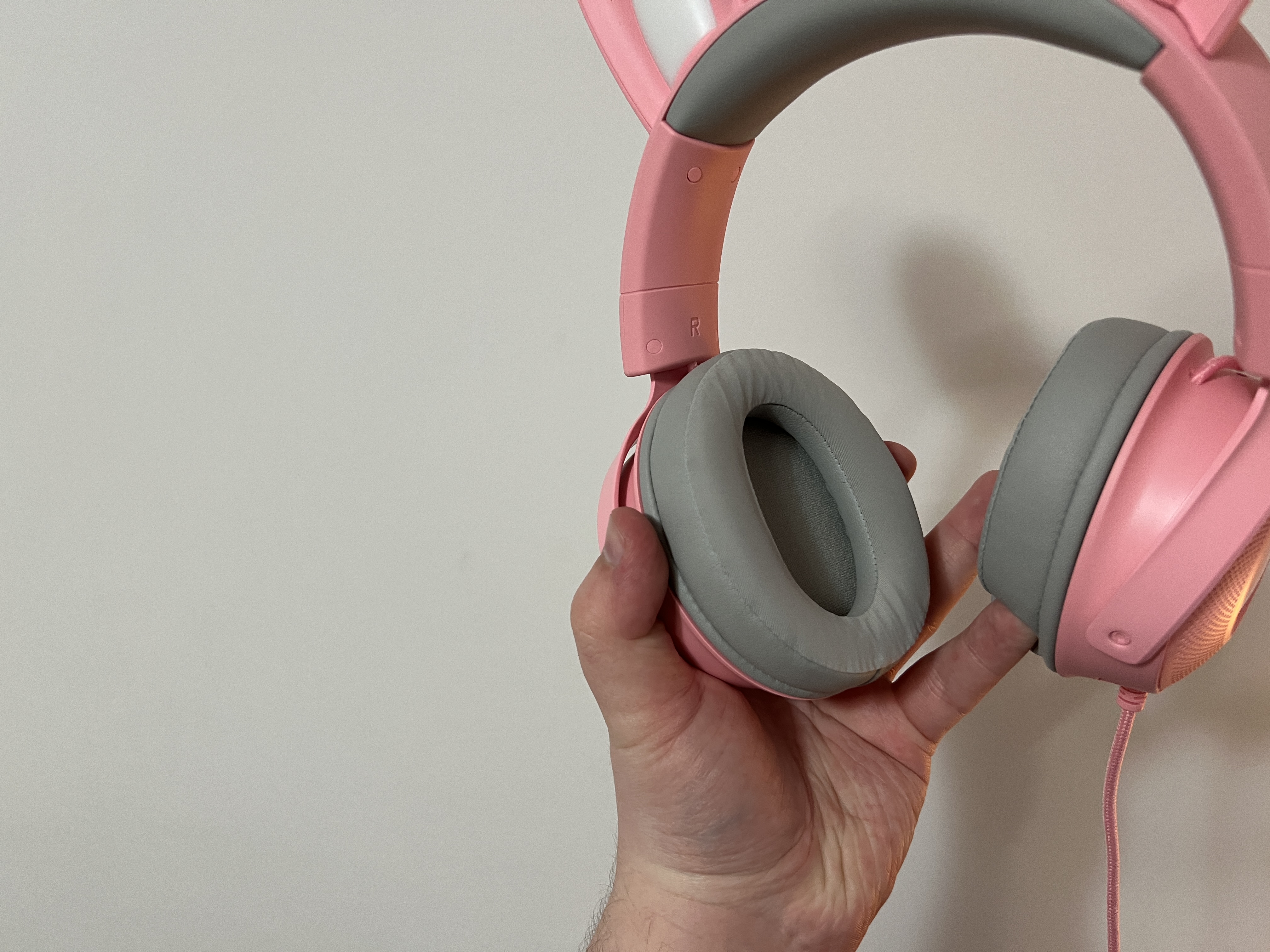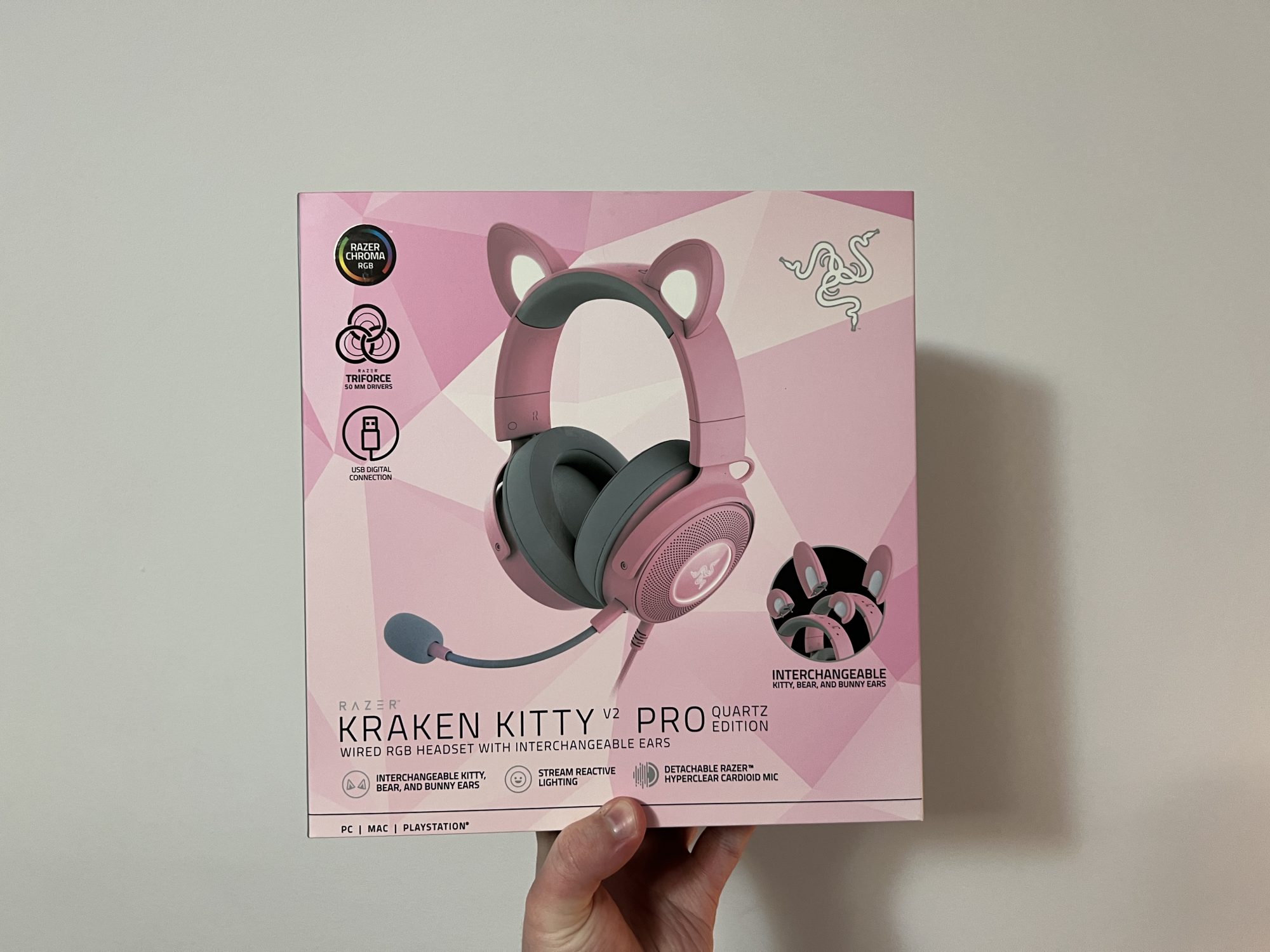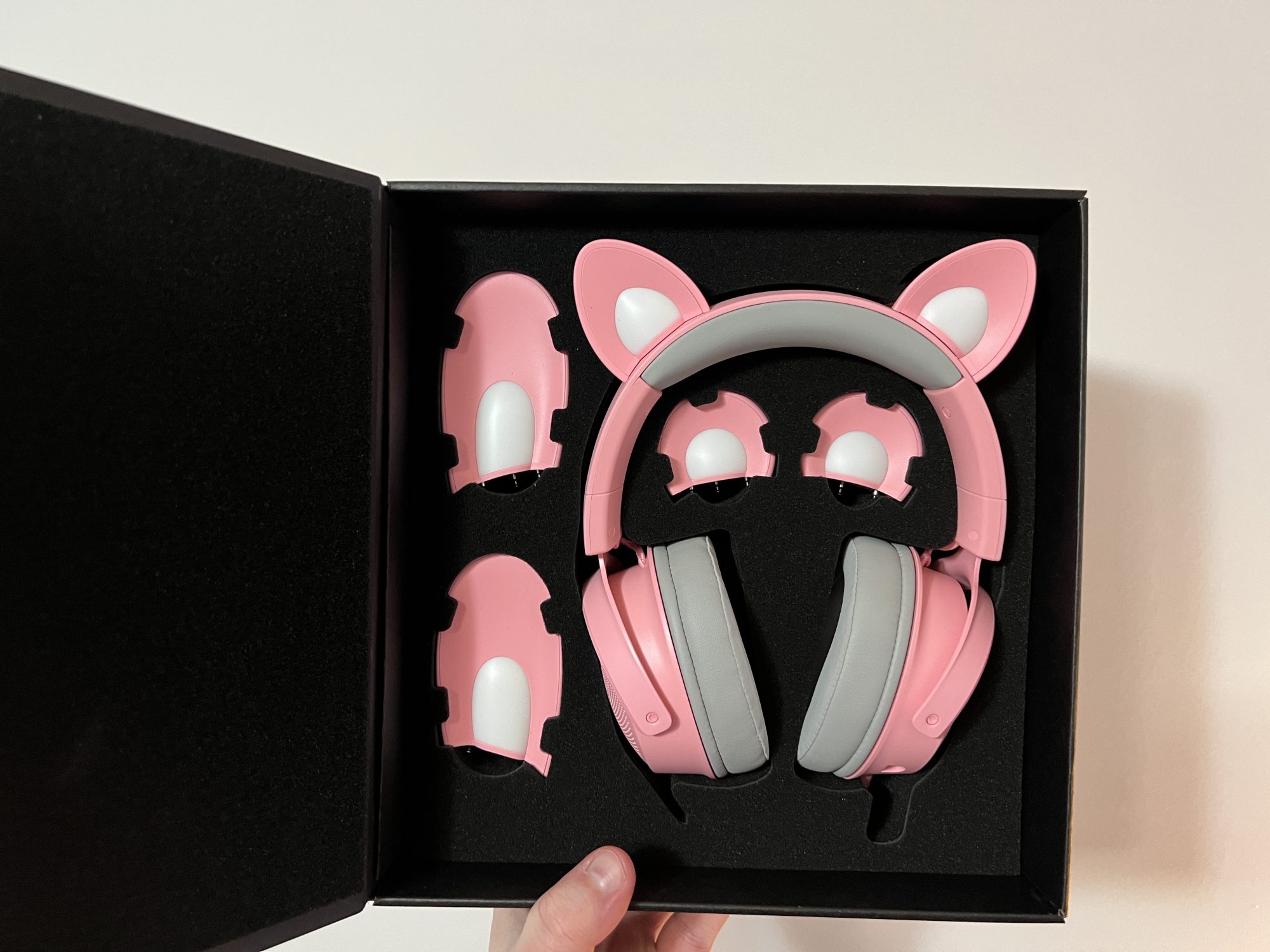 Ele vin pe roz sau negru, iar urechile se pot schimba foarte usor. In pachet sunt trei seturi de urechi de diferite marimi. Acestea sunt iluminate, la fel cum o sa gasiti iluminare si pe casca propriu-zisa. Microfonul este detasabil si fiind cu interfata USB, castile permit o personalizare foarte buna si functii specifice.