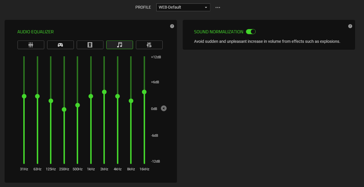 Tot controlul se face din Razer Synapse, de unde poti controla intensitatea subwoofer-ului, modurile de sunet, iluminarea boxei centrale si altele.