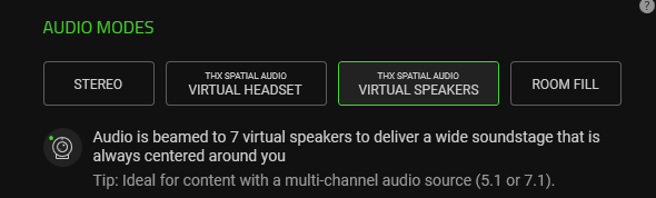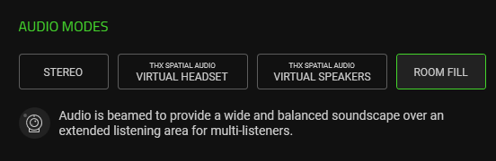 Ai la dispozitie patru tipuri de sunet: stereo, pentru cei care prefera sunetul curat, simplu. Modul THX Spatial Audio Virtual Headset, THX Spatial Audio Virtual Speakers si Room Fill. In functie de activitate si de camera puteti alege un profil potrivit si sa reglati egalizatorul dupa bunul plac.