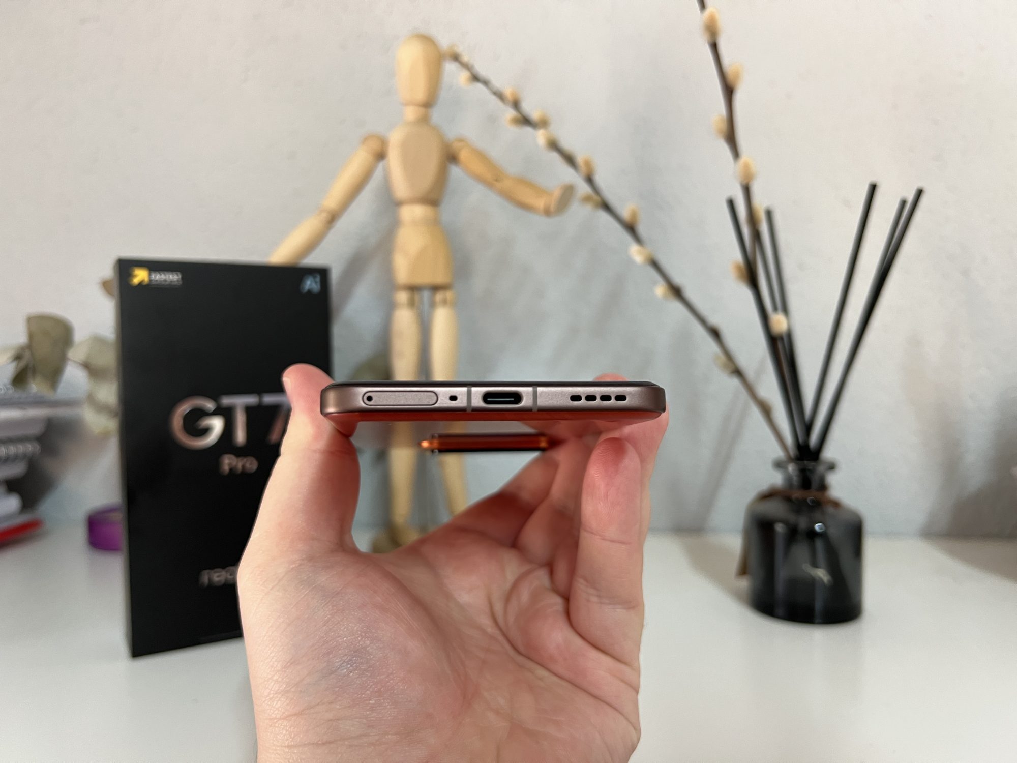 Deși realme nu reinventează roata în materie de design, GT 7 Pro reușește să arate foarte bine. Versiunea Mars Orange este cu adevărat spectaculoasă, având un aspect modern care îți rămâne în minte. Dimensiunile și proporțiile sunt perfecte, oferind un echilibru ideal între confort și utilizare practică. Nu este nici prea lat, nici prea lung – pur și simplu, un telefon care se simte bine în mână și care impresionează prin simplitate și stil.