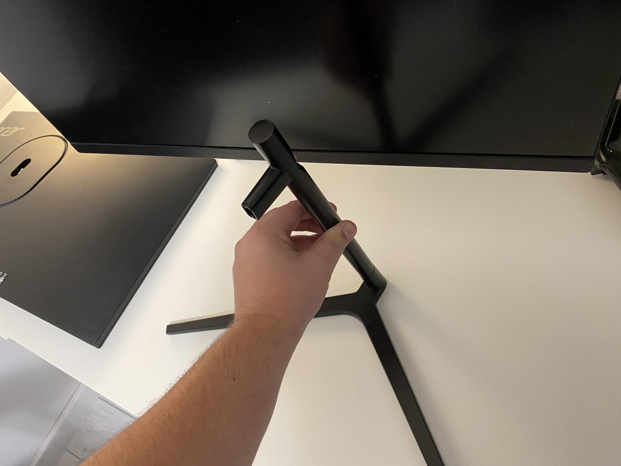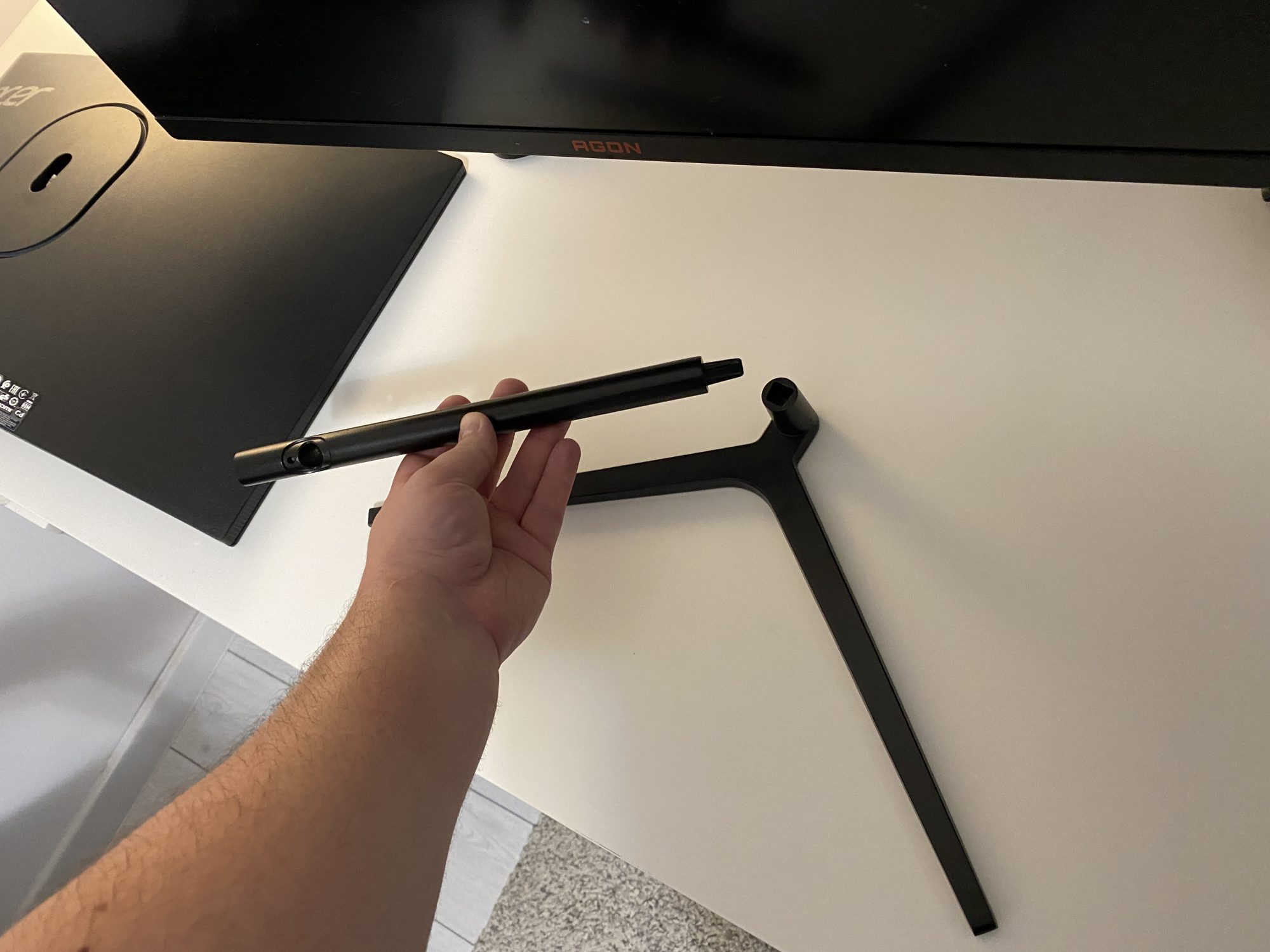 Practic monitorul se clipseaza de suport printr-un simplu click. Ai nevoie doar sa strangi doua suruburi si cam asta a fost tot. Suportul este si el simplu si parca ar fi un puzzle. Mai bine vedeti pozele. Da, suportul arata ca un injector de masina, am vazut si eu 😀