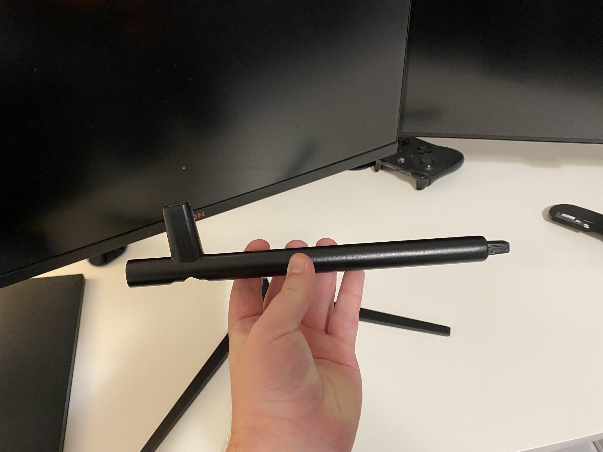 Piciorul este format din 2 elemente: bucata cu 2 brate care sta pe birou si un bat care face conexiunea dintre talpa si monitor. Doar ca montajul este atat de simplu incat am crezut ca este o gluma la prima vedere, dar este simplu, practic si eficient.