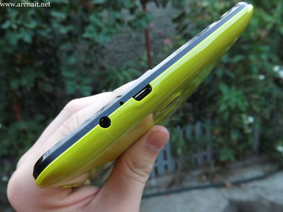 Tastele de volum si butonul de inchis tableta sunt situate in lateralul din dreapta, in stanga fiind situat slotul pentru cardul microSD. Celelalte porturi, jack-ul audio si portul microUSB sunt situate in partea de sus. Pe spate gasim camera de 5 MP fara blit, iar un pic mai jos grila pentru difuzor.
