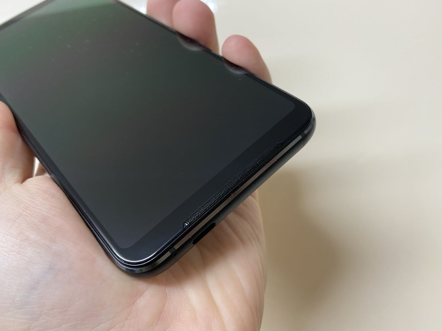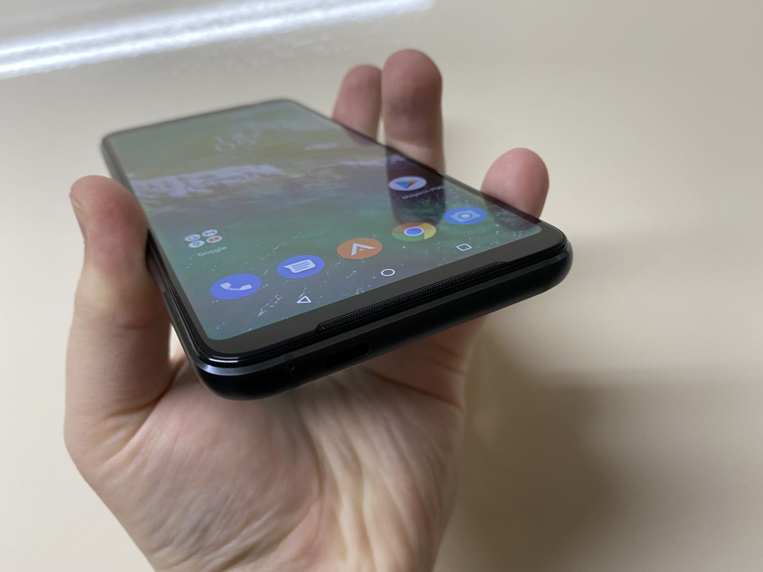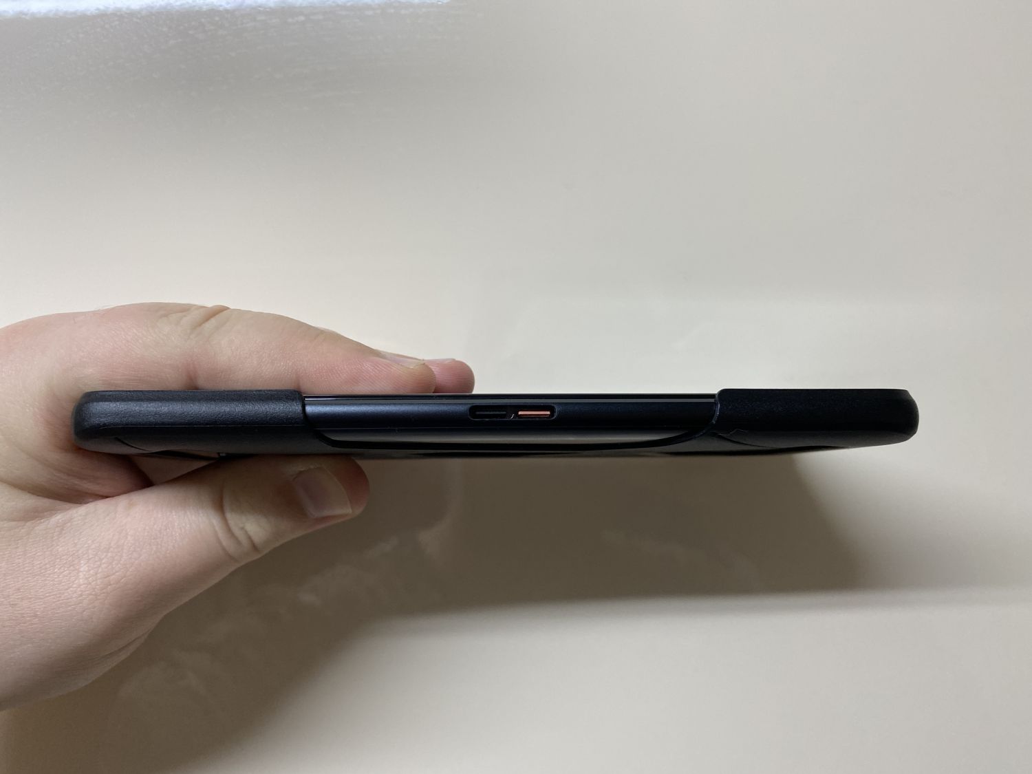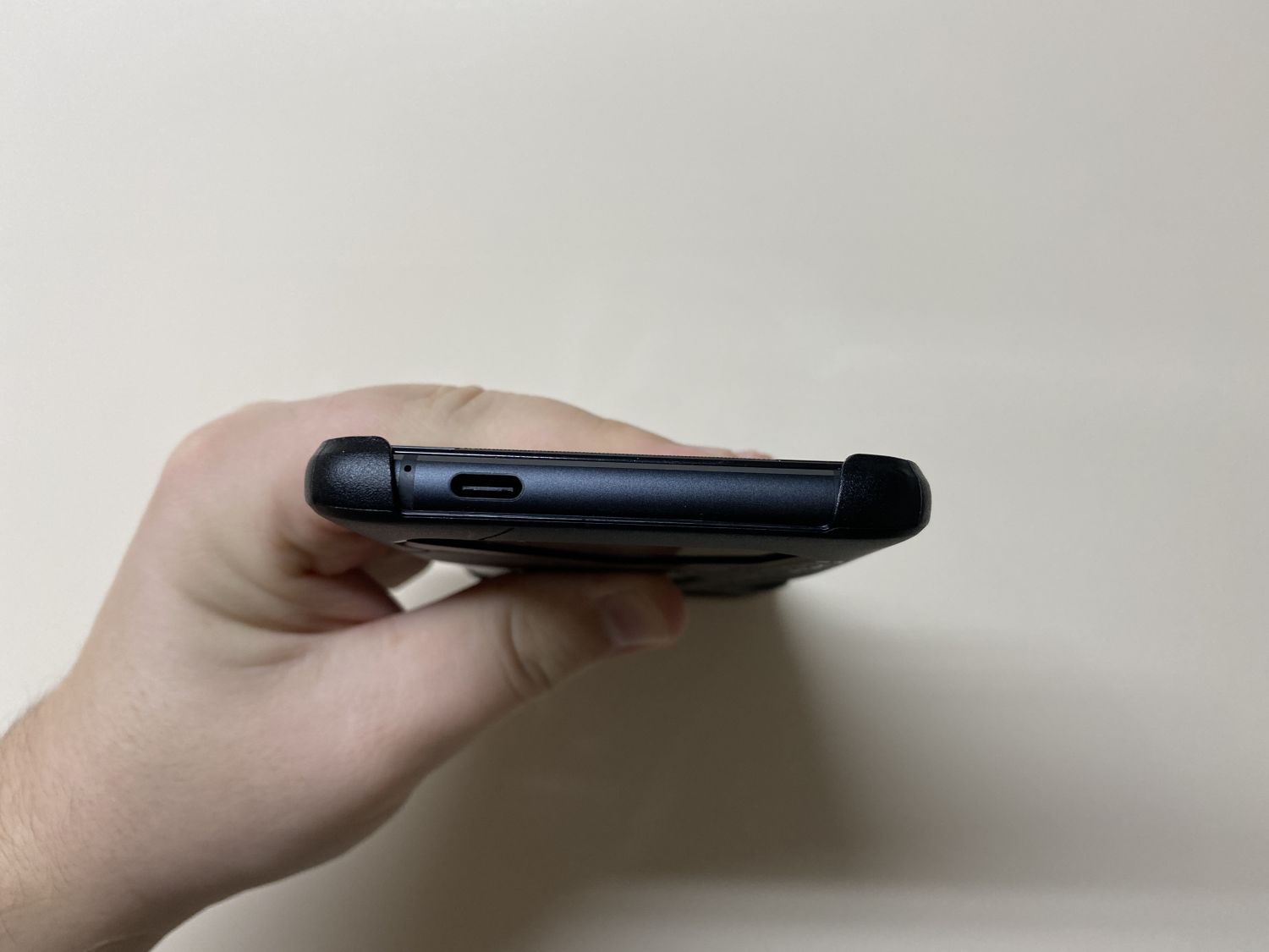 Pe partea stanga are un port USB Type C prin care telefonul se poate incarca atunci cand te joci. Este gandita in asa fel incat atunci cand te joci in mod landscape cablul sa vina in partea de jos si sa nu te incurce. Tot acolo se monteaza si ventilatorul din pachet care ajuta la racire. Mufa Type C principala este in partea de jos. Nu are jack pentru casti, iar butoanele de control sunt pe partea dreapta.