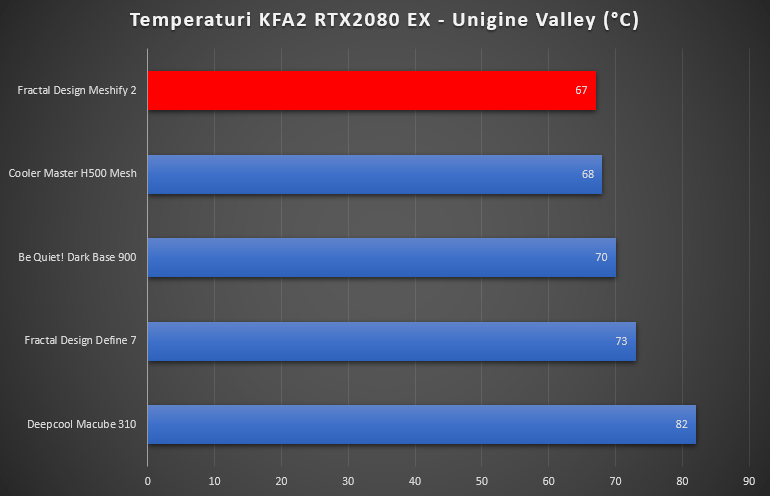 Cât despre airflow și temperaturi, Meshify 2 a obținut rezultate mult mai bune decât mă așteptam. Panoul perforat din față și cele două ventilatoare de 140 mm preinstalate își fac simțită prezența, Meshify 2 ocupând fruntea clasamentului. Cu toate acestea, nu aș recomanda instalarea unui radiator de cooler all-in-one în partea frontală a carcasei din simplul fapt că ar restricționa destul de mult ventilația la nivelul plăcii video. În configurația implicită, cu două ventilatoare Dynamic X2 GP-14 de 140 mm în față și unul în spate, la care am adăugat un cooler all-in-one Deepcool Gamerstorm Castle 240EX, temperaturile obținute au fost excelente, airflow-ul asigurat fiind potrivit chiar și pentru configurații HEDT. Carcasele au fost testate în configurație stock, fără alte ventilatoare adăugate, excepție făcând cele ale cooler-ului all-in-one. Testele în full load pentru procesor și placă video au fost rulate timp de o oră la o temperatură ambientală de 20 °C utilizând Prime95 26.6 și Unigine Valley, iar rezultatele mai mici sunt mai bune. Meshify 2 și Define 7 au fost testate atât în configurația deschisă, cât și în cea de stocare, însă nu am observat diferențe la nivel de temperaturi. Așa cum era de așteptat, Meshify 2 este puțin mai gălăgioasă decât Define 7, neavând atât de multe elemente de antifonare, însă compensează prin airflow-ul considerabil mai bun.