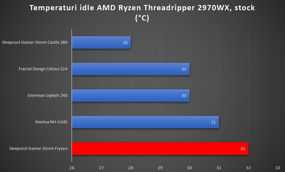Ce contează cu adevărat sunt temperaturile în load. Nu pentru overclocking, deoarece platformele HEDT nu au în general un potențial ridicat în acest sens, ci mai degrabă pentru a menține un nivel de performanță stabil. Vedeți voi, pe platformele mainstream, chiar și cu procesoare potente, de genul Intel Core i7-8700K și AMD Ryzen 2700X, nici pe un cooler stock nu vă veți lovi de throttling la setări stock. Pe HEDT, însă, unde sunt procesoare cu TDP chiar și de 250 wați, cum este 2970WX-ul nostru, thermal throttling-ul devine o problemă reală, iar fără un cooler solid, care să ofere o disipare termică bună, vă puteți lovi de scăderi drastice ale frecvențelor din cauza temperaturilor ridicate. În ciuda faptului că Deepcool Fryzen s-a situat la coada clasamentului nostru, temperatura maximă de 71 °C (cu doar 47 °C peste temperatura ambientală) a permis o operare perfect stabilă, fără nici cea mai mică urmă de thermal throttling. Ce e și mai interesant e că Deepcool Fryzen este cel mai compact cooler dintre toate cele testate, iar diferența de 2 °C față de Noctua NH-U14S este neglijabilă. Desigur, coolerele all-in-one vor avea mereu un avantaj, însă în cazul acestora costurile sunt mai mari, montarea este mai dificilă și, de ce să nu recunoaștem, există și riscul scurgerilor de lichid.