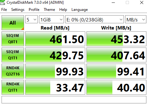 Am testat SSD-ul in doua benchmark-uri populare folosind ambele cabluri si un laptop cu USB C.
