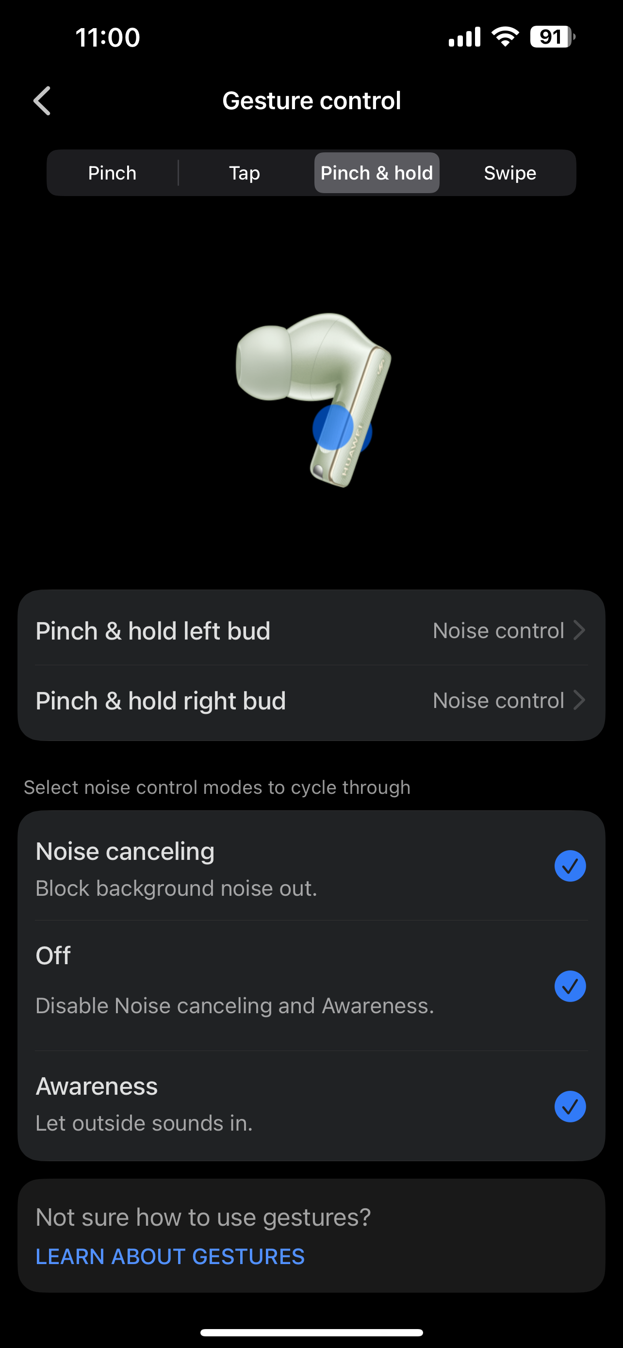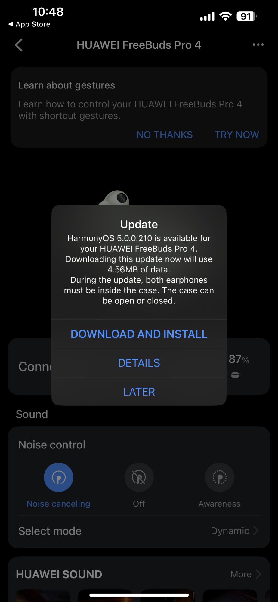 Și nu doar sunetul impresionează. Anularea zgomotului activă (Intelligent Dynamic ANC) este și ea la alt nivel. Huawei spune că elimină cu 30% mai mult zgomot decât generația anterioară, și sincer, chiar se simte. Sistemul cu trei microfoane, plus dopurile din spumă cu memorie, fac o treabă excelentă. Iar microfonul cu conducție osoasă care detectează vibrațiile din oase pentru a izola vocea utilizatorului? Pe mine m-a lăsat fără cuvinte. Băi, băiatule! In plus, functia ANC anuleaza zgomotului ambiental de pana la 100 dB si face fata vantului de pana la 10 m/s, conform producatorului.