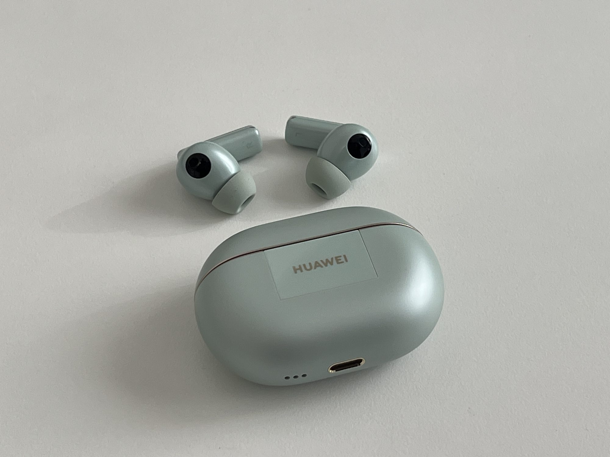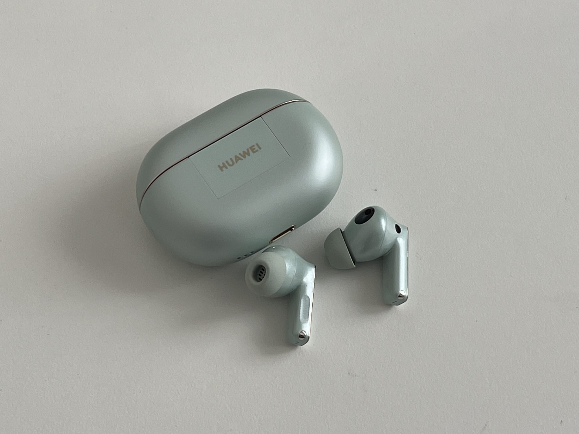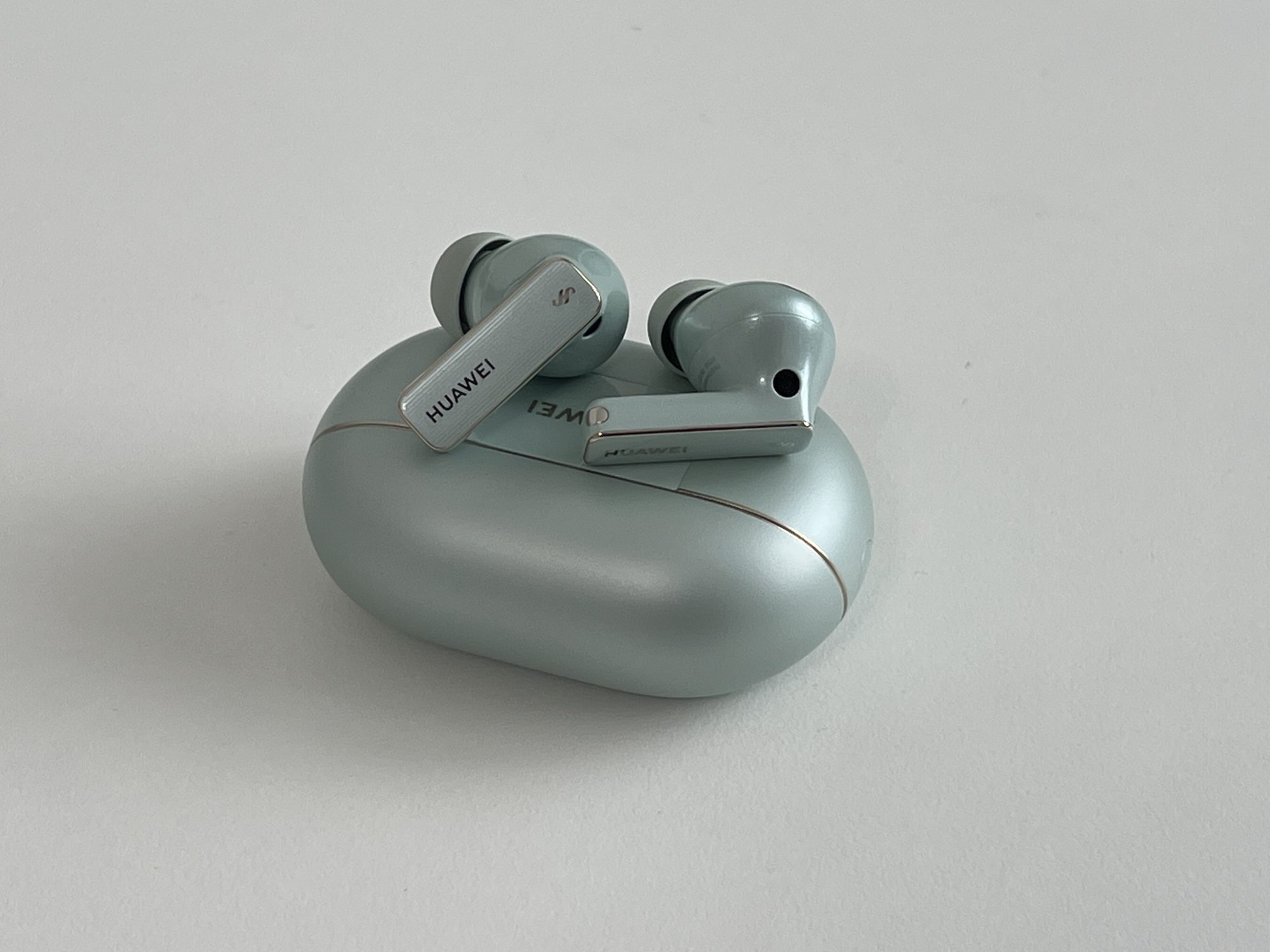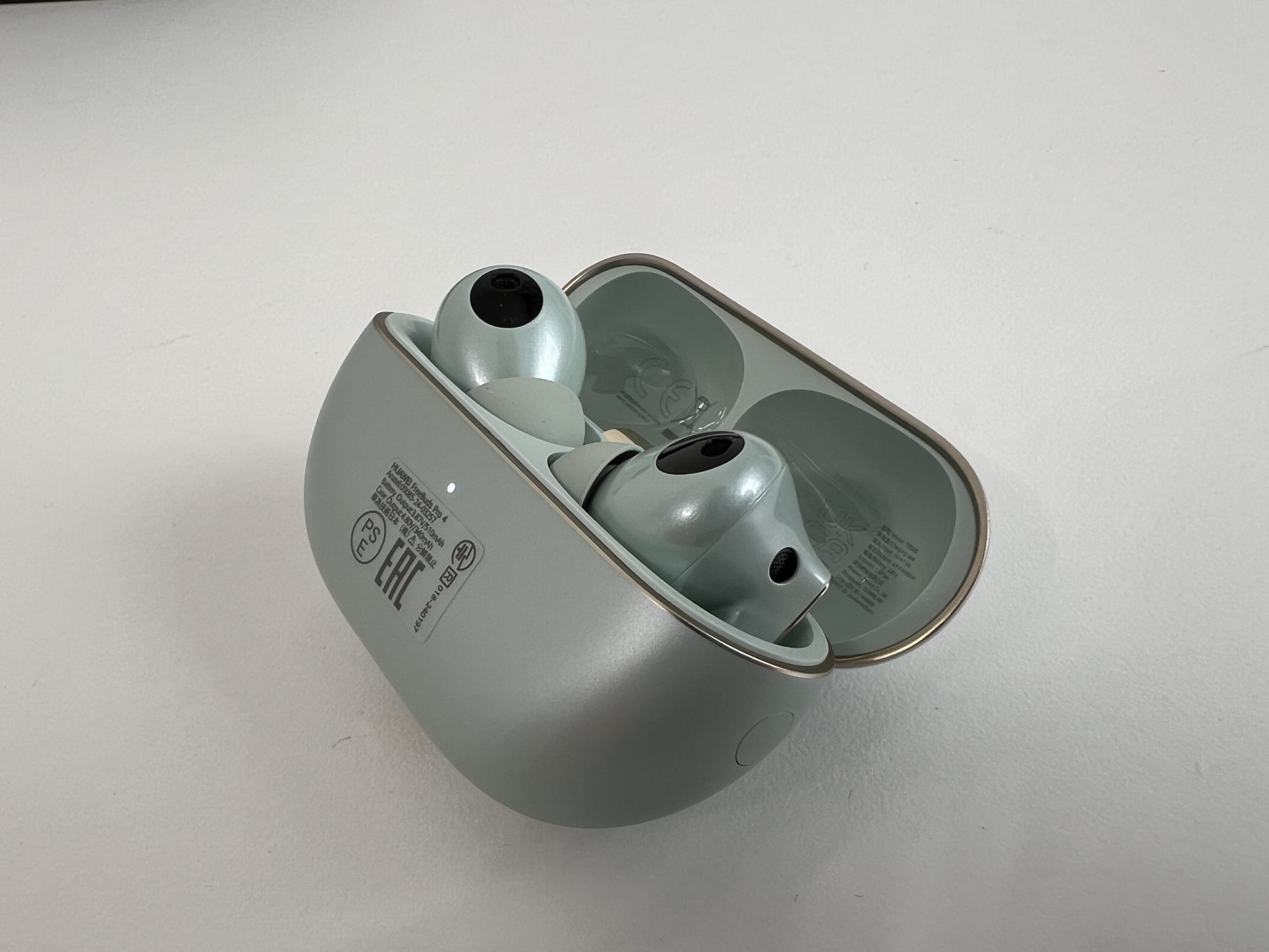FreeBuds Pro 4 au un design clasic de căști true wireless in-ear. Acum, pe bune, nu le poți face să arate altfel, dar chiar și așa, arată bine! Sunt făcute dintr-un plastic lucios, de calitate, și vin în trei culori: verde, alb și negru. Varianta verde are o nuanță așa, de ou de rață – nu zic că-mi place sau nu, dar fiecare cu preferințele lui. Carcasa e și ea tot verde, lucioasă, compactă și suficient de mică încât să o bagi în buzunar fără să te enerveze.