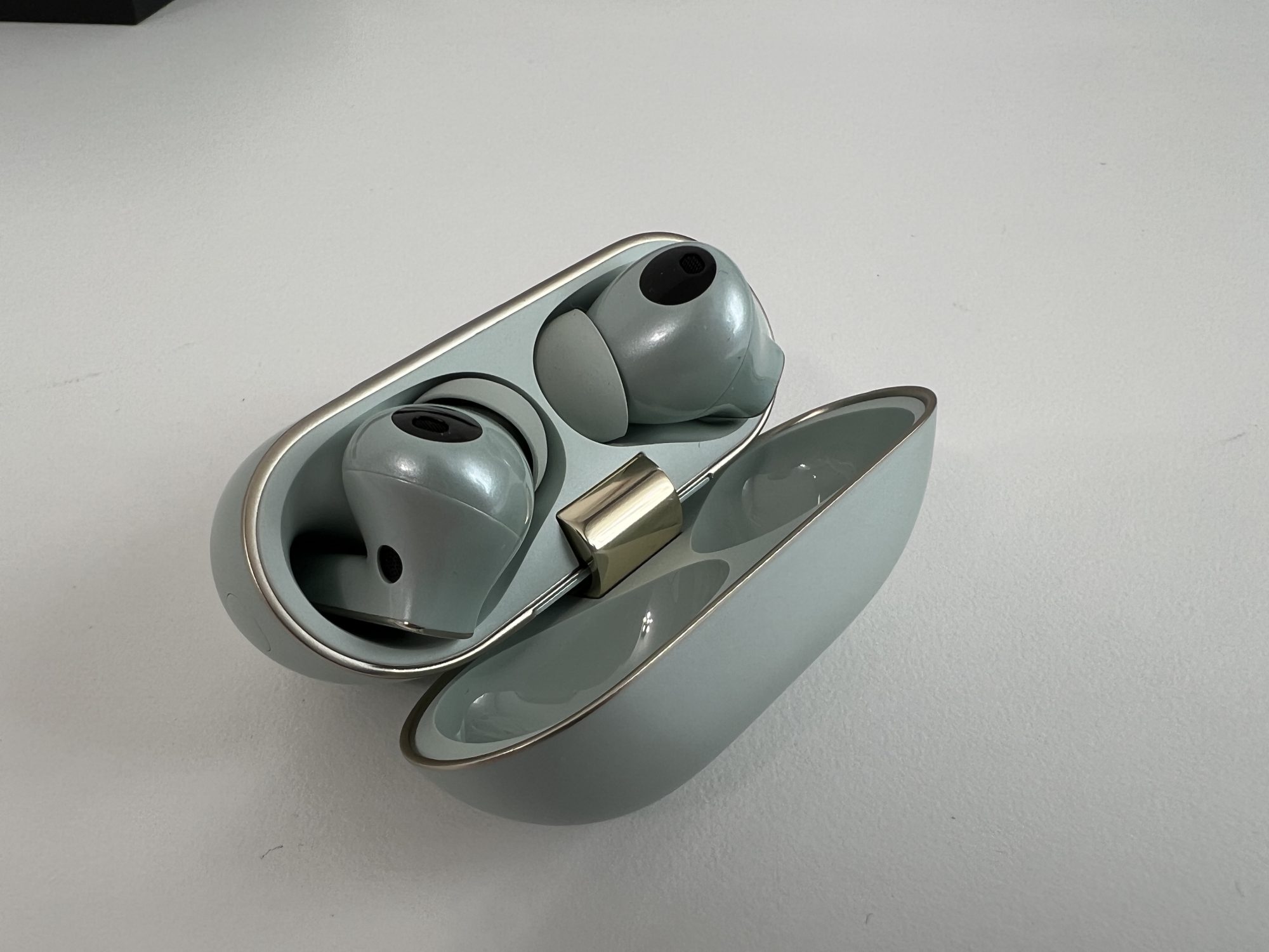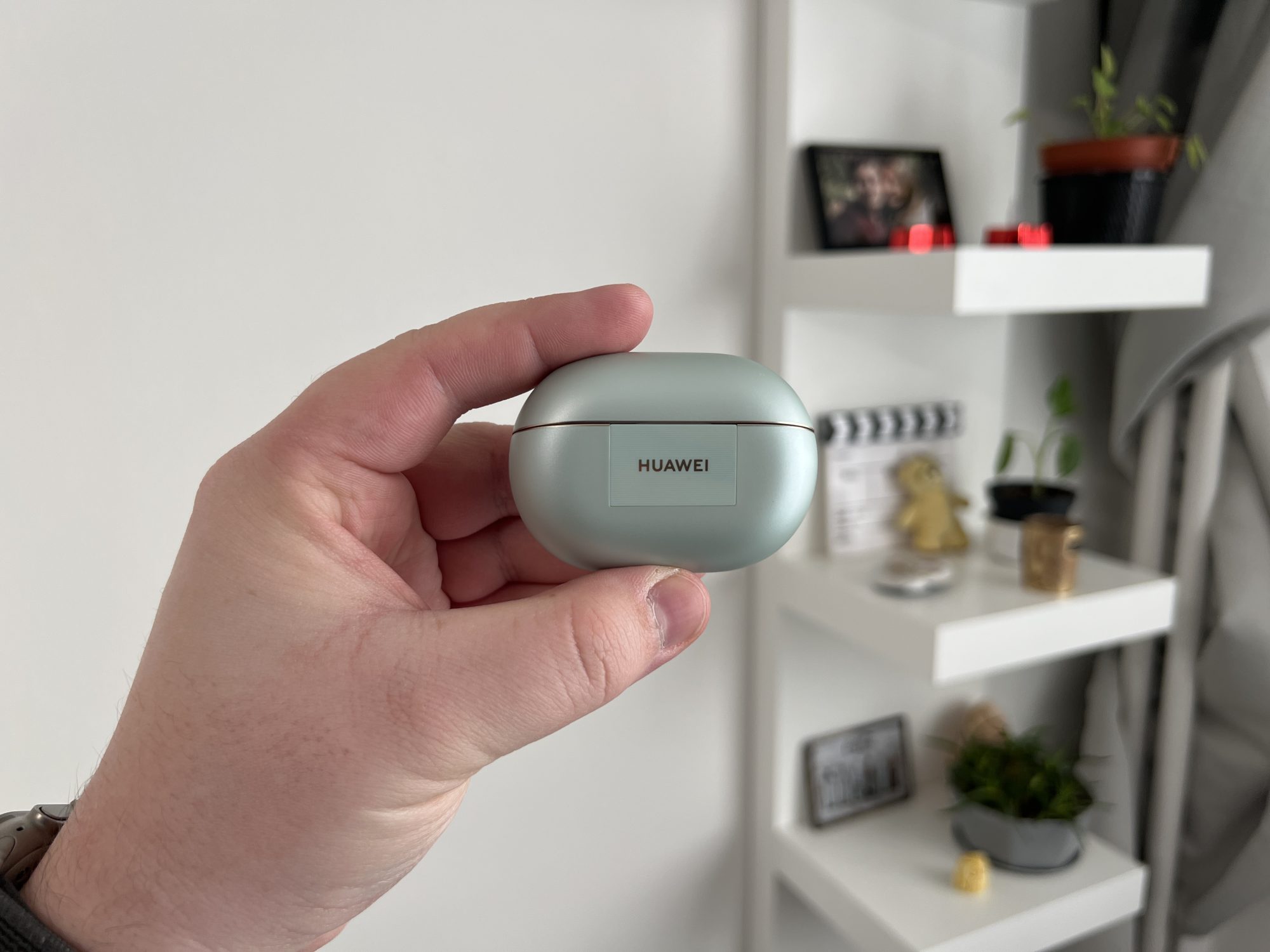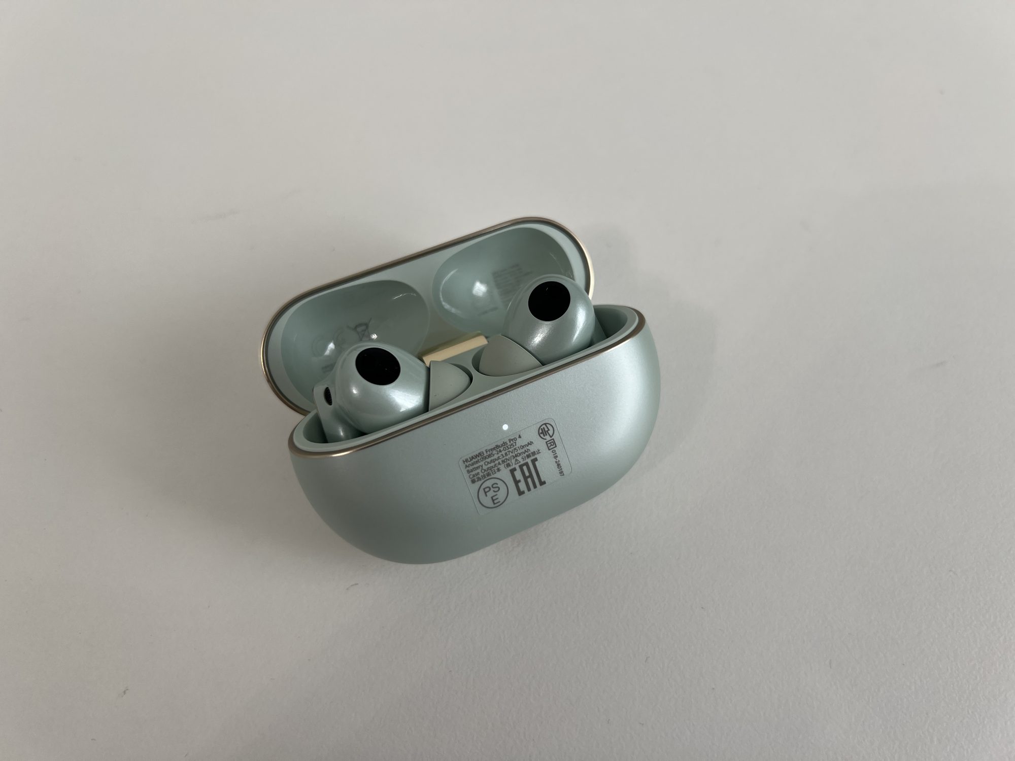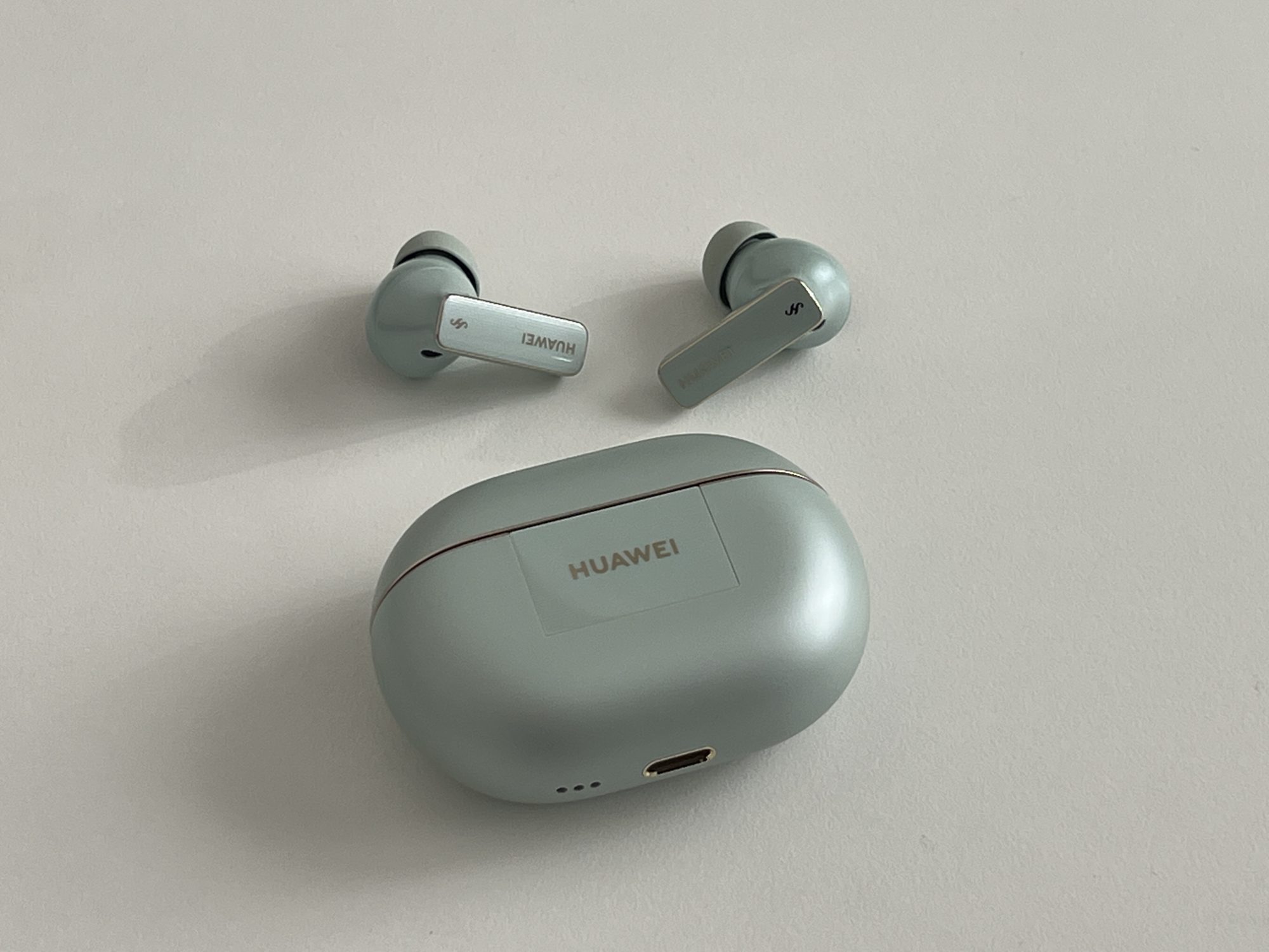 FreeBuds Pro 4 au un design clasic de căști true wireless in-ear. Acum, pe bune, nu le poți face să arate altfel, dar chiar și așa, arată bine! Sunt făcute dintr-un plastic lucios, de calitate, și vin în trei culori: verde, alb și negru. Varianta verde are o nuanță așa, de ou de rață – nu zic că-mi place sau nu, dar fiecare cu preferințele lui. Carcasa e și ea tot verde, lucioasă, compactă și suficient de mică încât să o bagi în buzunar fără să te enerveze.